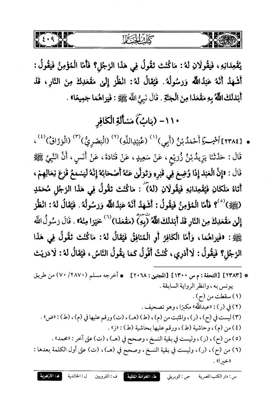 2384- أَخبَرنا أَحْمَدُ بنُ أَبِي عُبَيدِ اللهِ البَصْرِيُّ الوَرَّاقُ، قَالَ: حَدثنا يَزِيدُ بنُ زُرَيْعٍ، عَنْ سَعِيدٍ، عَنْ قَتَادَةَ، عَنْ أَنَسٍ، أَنَّ النَّبِيَّ صَلى الله عَليه وسَلم قَالَ: إِنَّ العَبدَ إِذَا وُضِعَ فِي قَبْرِهِ وَتَوَلَّى عَنْهُ أَصْحَابُهُ، إِنَّهُ لَيَسْمَعُ قَرْعَ نِعَالِهِمْ، أَتَاهُ مَلَكَانِ فَيُقْعِدَانِهِ فَيَقُولاَنِ له: مَا كُنْتَ تَقُولُ فِي هَذَا الرَّجُلِ مُحَمدٍ صَلى الله عَليه وسَلم؟، فَأَمَّا المُؤْمِنُ فَيَقُولُ: أَشْهَدُ أَنَّهُ عَبدُ اللهِ وَرَسُولُهُ، فَيُقَالُ لَهُ: انْظُرْ إِلَى مَقْعَدِكَ مِنَ النَّارِ، قَدْ أَبْدَلَكَ اللهُ به مقعدا خَيْرًا مِنْهُ، قَالَ رَسُولُ اللهِ صَلى الله عَليه وسَلم: فَيَرَاهُمَا، وَأَمَّا الكَافِرُ أَوِ المُنَافِقُ، فَيُقَالُ لَهُ: مَا كُنْتَ تَقُولُ فِي هَذَا الرَّجُلِ؟ فَيَقُولُ: لاَ أَدْرِي كُنْتُ أَقُولُ كَمَا يَقُولُ النَّاسُ، فَيُقَالُ لَهُ: لاَ دَرَيْتَ وَلاَ تَلَيْتَ، ثُمَّ يُضْرَبُ ضَرْبَةً بَيْنَ أُذُنَيْهِ فَيَصِيحُ صَيْحَةً فَيَسْمَعُهُ مَنْ يلِيهِ غَيْرَ الثَّقَلَيْنِ.