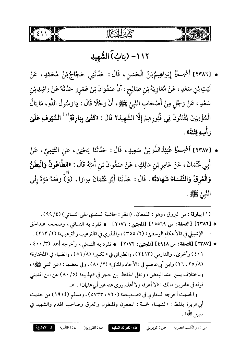 2386- أَخبَرني إِبرَاهِيمُ بنُ الحَسَنِ، حَدَّثَنِي حَجَّاجُ بنُ مُحَمدٍ، عَنْ لَيْثِ بْنِ سَعْدٍ، عَنْ مُعَاوِيَةَ بْنِ صَالِحٍ، أَنَّ صَفْوَانَ بْنَ عَمْرٍو حَدَّثَهُ عَنْ رَاشِدِ بْنِ سَعْدٍ، عَنْ رَجُلٍ مِنْ أَصْحَابِ النَّبِيِّ صَلى الله عَليه وسَلم، أَنَّ رَجُلاً قَالَ: يَا رَسُولَ اللهِ، مَا بَالُ المُؤْمِنِينَ يُفْتَنُونَ فِي قُبُورِهِمْ إِلاَّ الشَّهِيدَ؟ قَالَ: كَفَى بِبَارِقَةِ السُّيُوفِ عَلَى رَأْسِهِ فِتْنَةً.