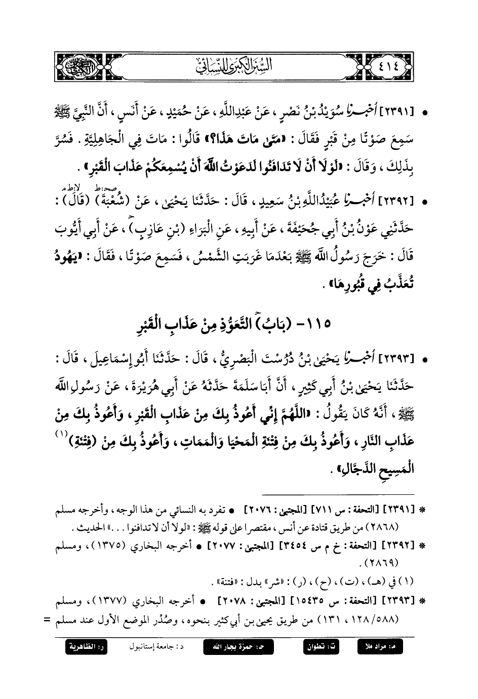 2391- أَخبَرنا سُوَيْدُ بنُ نَصْرٍ، عَنْ عَبدِ اللهِ، عَنْ حُمَيْدٍ، عَنْ أَنَسٍ، أَنَّ النَّبِيَّ صَلى الله عَليه وسَلم سَمِعَ صَوْتًا مِنْ قَبْرٍ، فَقَالَ: مَتَى مَاتَ هَذَا؟ قَالُوا: مَاتَ فِي الجَاهِلِيَّةِ، فَسُرَّ بِذَلِكَ، وَقَالَ: لَوْلاَ أَنْ لاَ تَدَافَنُوا لَدَعَوْتُ اللهَ أَنْ يُسْمِعَكُمْ عَذَابَ القَبْرِ.
