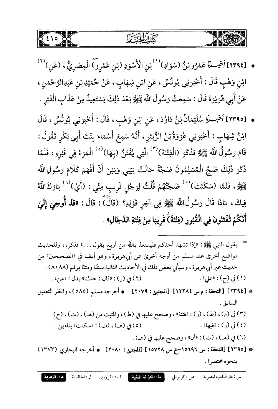 2394- أَخبَرنا عَمرُو بنُ سَوَّادِ بْنِ الأَسْوَدِ بن عَمرُو المِصْرِيُّ، عَنِ ابنِ وَهْبٍ، قَالَ: أَخبَرني يُونُسُ، عَنِ ابنِ شِهَابٍ، عَنْ حُمَيْدِ بْنِ عَبدِ الرَّحْمَنِ، عَنْ أَبِي هُرَيرَةَ، قَالَ: سَمِعْتُ رَسُولَ اللهِ صَلى الله عَليه وسَلم بَعْدَ ذَلِكَ يَسْتَعِيذُ مِنْ عَذَابِ القَبْرِ.