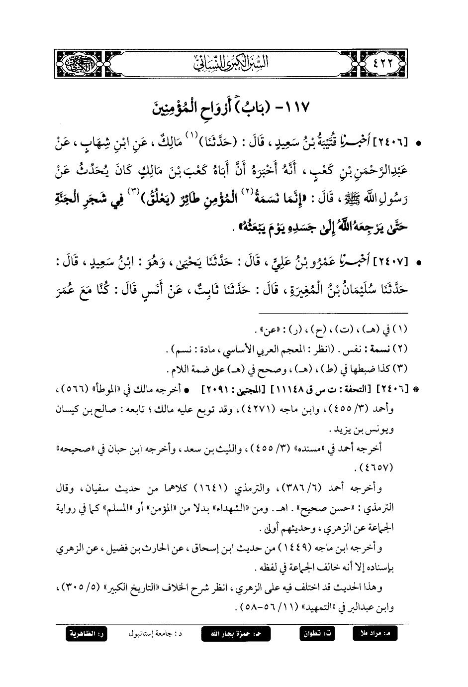 2406- أَخبَرنا قُتَيبَةُ بنُ سَعِيدٍ، قَالَ: حَدثنا مَالِكٍ، عَنِ ابنِ شِهَابٍ، عَنْ عَبدِ الرَّحْمَنِ بْنِ كَعْبٍ، أَنَّهُ أَخبَرَهُ؛ أَنَّ أَبَاهُ كَعْبَ بْنَ مَالِكٍ كَانَ يُحَدِّثُ عَنْ رَسُولِ اللهِ صَلى الله عَليه وسَلم قَالَ: إِنَّمَا نَسَمَةُ المُؤْمِنِ طَائِرٌ يَعْلُقُ فِي شَجَرِ الجَنَّةِ حَتَّى يُرْجِعَهُ اللهُ إِلَى جَسَدِهِ يَوْمَ يَبْعَثُهُ.