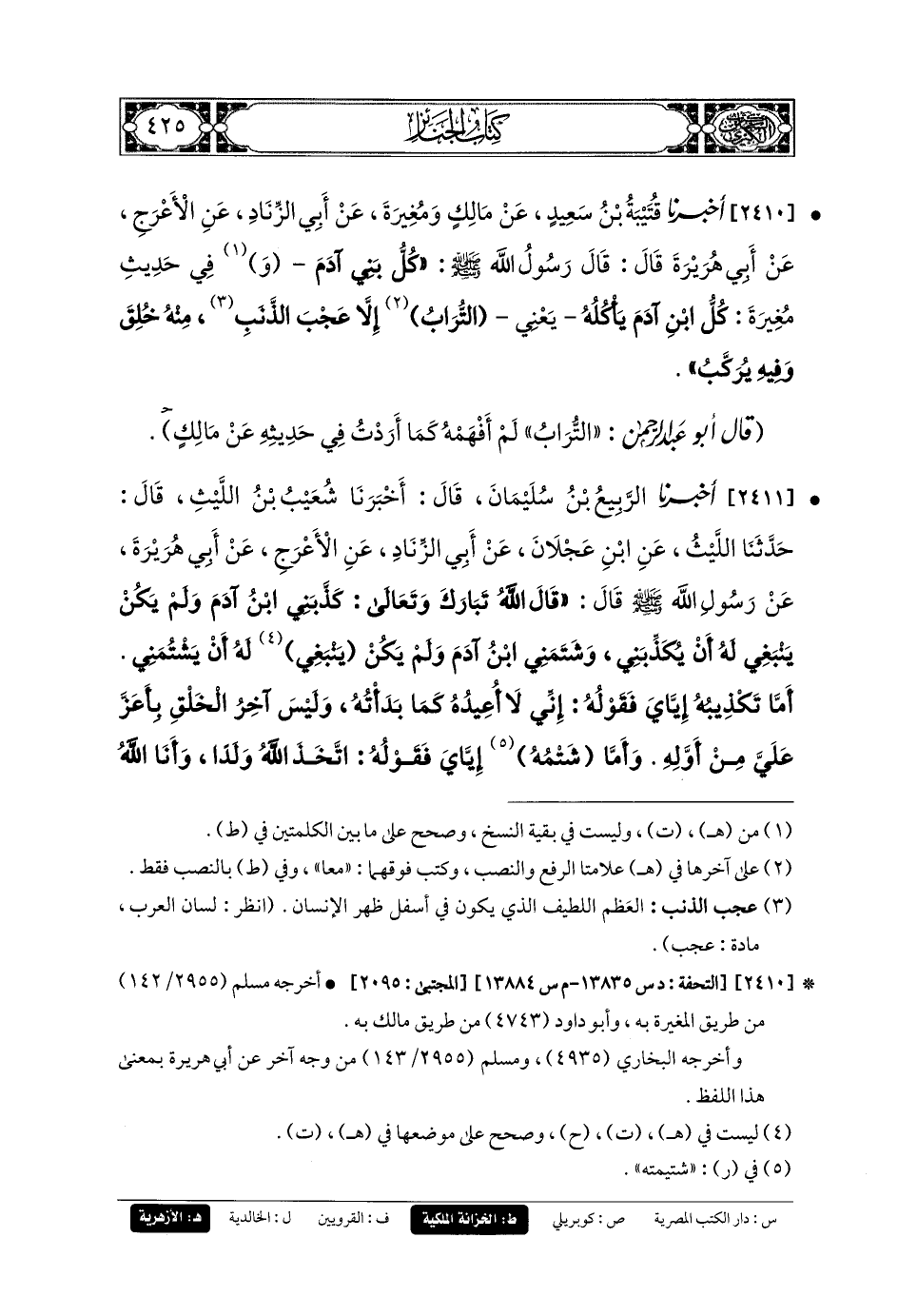 2410- أَخبَرنا قُتَيبَةُ بنُ سَعِيدٍ، عَنْ مَالِكٍ، وَمُغِيرَةَ، عَنْ أَبِي الزِّنَادِ، عَنِ الأَعْرَجِ، عَنْ أَبِي هُرَيرَةَ قَالَ: قَالَ رَسُولُ اللهِ صَلى الله عَليه وسَلم: كُلُّ بَنِي آدَمَ، وَفِي حَدِيثِ مُغِيرَةَ، كُلُّ ابنِ آدَمَ يَأْكُلُهُ، يَعْنِي التُّرَابُ، إِلاَّ عَجْبَ الذَّنَبِ مِنْهُ، خُلِقَ وَفِيهِ يُرَكَّبُ.