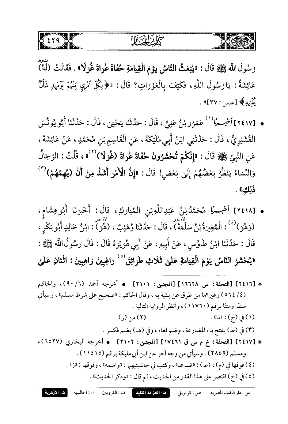 2417- أَخبَرنا عَمرُو بنُ عَلِيٍّ، قَالَ: حَدثنا يَحيَى، قَالَ: حَدثنا أَبُو يُونُسَ القُشَيْرِيُّ، قَالَ: حَدَّثَنِي ابنُ أَبِي مُلَيْكَةَ، عَنِ القَاسِمِ بْنِ مُحَمدٍ، عَنْ عَائِشَةَ، عنِ النَّبِيِّ صَلى الله عَليه وسَلم قَالَ: إِنَّكُمْ تُحْشَرُونَ حُفَاةً عُرَاةً غُرْلاً، قُلْتُ: الرِّجَالُ وَالنِّسَاءُ يَنْظُرُ بَعْضُهُمْ إِلَى بَعْضٍ؟ قَالَ: إِنَّ الأَمْرَ أَشَدُّ مِنْ أَنْ يُهِمَّهُمْ ذَلِكَ.