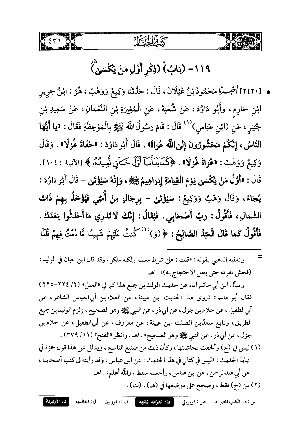 2420- أَخبَرنا مَحْمُودُ بنُ غَيْلاَنَ، قَالَ حَدثنا وَكِيعٌ، وَوَهْبٌ، هُوَ ابنُ جَرِيرِ بْنِ حَازِمٍ، وَأَبُو دَاودَ، عَنْ شُعبَةَ، عَنِ المُغِيرَةِ بْنِ النُّعْمَانِ، عَنْ سَعِيدِ بْنِ جُبَيرٍ، عَنِ ابنِ عَبَّاسٍ قَالَ: قَامَ رَسُولُ اللهِ صَلى الله عَليه وسَلم بِالمَوْعِظَةِ، فَقَالَ: يَا أَيُّهَا النَّاسُ، إِنَّكُمْ مَحْشُورُونَ إِلَى اللهِ عُرَاةً، قَالَ أَبُو دَاودَ: حُفَاةً غُرْلاً، وَقَالَ وَكِيعٌ، وَوَهْبٌ: عُرَاةً غُرْلاً، {كَمَا بَدَأْنَا أَوَّلَ خَلْقٍ نُعِيدُهُ} قَالَ: أَوَّلُ مَنْ يُكْسَى يَوْمَ القِيَامَةِ إِبرَاهِيمُ صلى الله عليه وسلم، وَإِنَّهُ سَيُؤْتَى، قَالَ أَبُو دَاودَ: يُجَاءُ، وَقَالَ وَهْبٌ، وَوَكِيعٌ: سَيُؤْتَى بِرِجَالٍ مِنْ أُمَّتِي فَيُؤْخَذُ بِهِمْ ذَاتَ الشِّمَالِ، فَأَقُولُ: رَبِّ أَصْحَابِي، فَيُقَالُ: إِنَّكَ لاَ تَدْرِي مَا أَحْدَثُوا بَعْدَكَ، فَأَقُولُ كَمَا قَالَ العَبدُ الصَّالِحُ: {وَكُنْتُ عَلَيْهِمْ شَهِيدًا مَا دُمْتُ فِيهِمْ فَلَمَّا تَوَفَّيْتَنِي كُنْتَ أَنْتَ الرَّقِيبَ عَلَيْهِمْ وَأَنْتَ عَلَى كُلِّ شَيْءٍ شَهِيدٌ إِنْ تُعَذِّبْهُمْ فَإِنَّهُمْ عِبَادُكَ وَإِنْ تَغْفِرْ لَهُمْ فَإِنَّكَ أَنْتَ العَزِيزُ الحَكِيمُ}، فَيُقَالُ: إِنَّ هَؤُلاَءِ لَمْ يَزَالُوا مُدْبِرِينَ، قَالَ أَبُو دَاودَ: مُرْتَدِّينَ عَلَى أَعْقَابِهِمْ مُنْذُ فَارَقْتَهُمْ.