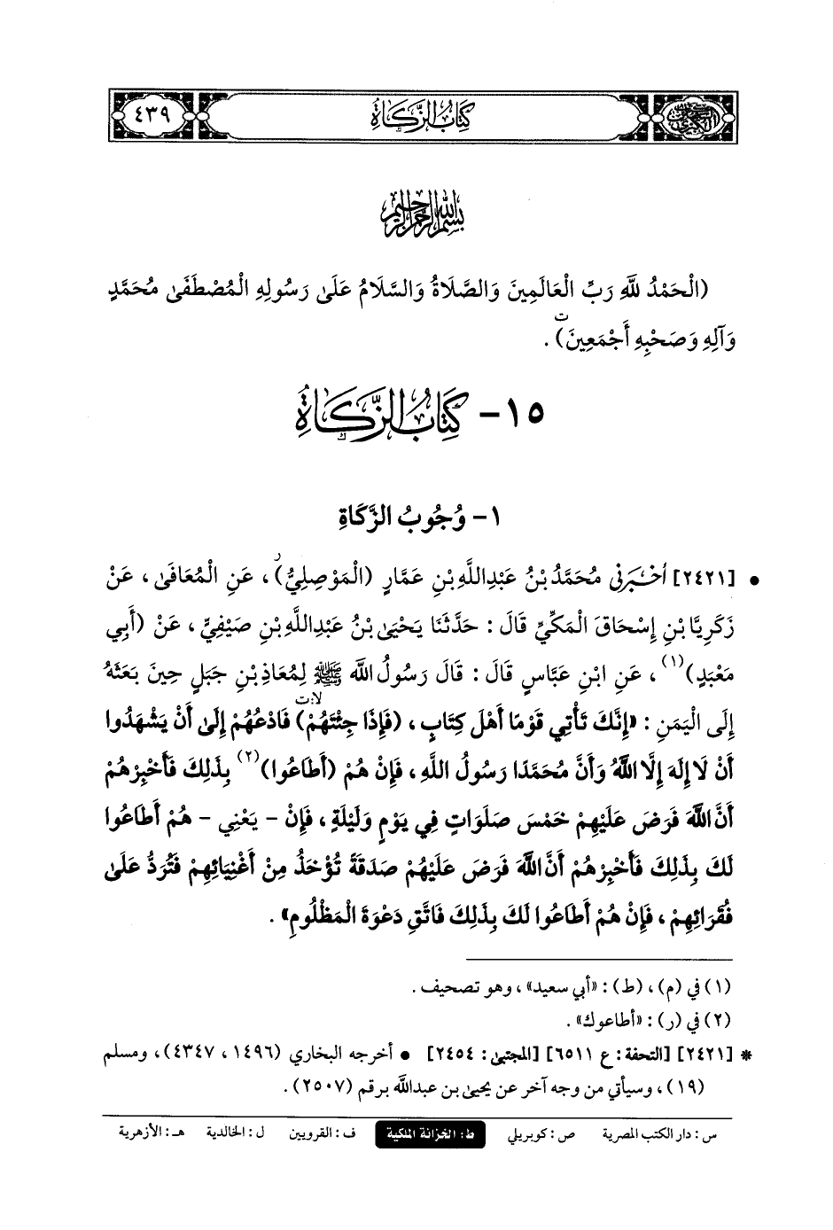 2421 - أَخبَرنا مُحَمدُ بنُ عَبدِ اللهِ بْنِ عَمَّارٍ المَوْصليُّ، عَنِ المُعَافَى، عَنْ زَكَرِيَّا بْنِ إِسْحَاقَ المَكِّيِّ، قَالَ: حَدثنا يَحيَى بنُ عَبدِ اللهِ بْنِ صَيْفِيٍّ، عَنْ أَبِي مَعْبَدٍ، عَنِ ابنِ عَبَّاسٍ قَالَ: قَالَ رَسُولُ اللهِ صَلى الله عَليه وسَلم لِمُعَاذِ بْنِ جَبَلٍ حِينَ بَعَثَهُ إِلَى اليَمَنِ: إِنَّكَ تَأْتِي قَوْمًا أَهْلَ كِتَابٍ، فَإِذَا جِئْتَهُمْ، فَادْعُهُمْ إِلَى أَنْ يَشْهَدُوا أَنْ لاَ إِلَهَ إِلاَّ اللهُ، وَأَنَّ مُحَمدًا رَسُولُ اللهِ، فَإِنْ هُمْ أَطَاعُوا بِذَلِكَ، فَأَخْبِرْهُمْ أَنَّ اللهَ فَرَضَ عَلَيْهِمْ خَمْسَ صَلَوَاتٍ فِي يَوْمٍ وَلَيْلَةٍ، فَإِنْ، يَعْنِي، هُمْ أَطَاعُوا لَكَ بِذَلِكَ، فَأَخْبِرْهُمْ أَنَّ اللهَ فَرَضَ عَلَيْهِمْ صَدَقَةُ تُؤْخَذُ مَنْ أَغْنِيَائِهِمْ، فَتُرَدُّ عَلَى فُقَرَائِهِمْ، فَإِنْ هُمْ أَطَاعُوا لَكَ بِذَلِكَ، فَاتَّقِ دَعْوَةَ المَظْلُومِ.