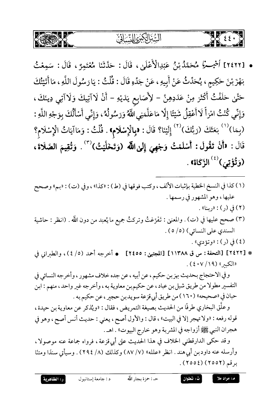 2422- أَخبَرنا مُحَمدُ بنُ عَبدِ الأَعْلَى، قَالَ: حَدثنا مُعْتَمِرٌ، قَالَ: سَمِعْتُ بَهْزَ بْنَ حَكِيمٍ يُحَدِّثُ عَنْ أَبِيهِ، عَنْ جَدِّهِ قَالَ: قُلْتُ: يَا نَبِيَّ اللهِ، مَا أَتَيْتُكَ حَتَّى حَلَفْتُ أَكْثَرَ مِنْ عَدَدِهِنَّ، لأَصَابِعِ يَدَيْهِ، أَنْ لاَ آتِيَكَ وَلاَ آتِيَ دِينَكَ، وَإِنِّي كُنْتُ امْرَءًا لاَ أَعْقِلُ شَيْئًا إِلاَّ مَا عَلَّمَنِي اللهُ وَرَسُولُهُ، وَإِنِّي أَسْأَلُكَ بِوَجْهِ اللهِ: بِمَ بَعَثَكَ رَبُّكَ إِلَيْنَا؟ قَالَ: بِالإِسْلاَمِ، قُلْتُ: وَمَا آيَاتُ الإِسْلاَمِ؟ قَالَ: أَنْ تَقُولَ: أَسْلَمْتُ وَجْهِي إِلَى اللهِ، وَتَخَلَّيْتُ، وَتُقِيمَ الصَّلاَةَ، وَتُؤْتِي الزَّكَاةَ.