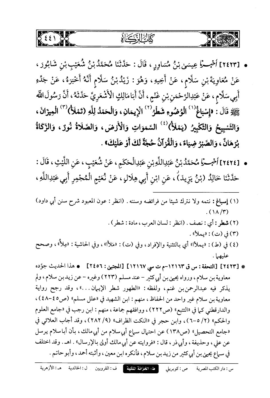 2423- أَخبَرنا عِيسَى بنُ مُسَاوِرٍ، قَالَ: حَدثنا مُحَمدُ بنُ شُعَيبِ بْنِ شَابُورَ، عَنْ مُعَاوِيَةَ بْنِ سَلاَّمٍ، عَنْ أَخِيهِ، وَهُوَ زَيْدُ بنُ سَلاَّمٍ، أَنَّهُ أَخبَرَهُ عَنْ جَدِّهِ أَبِي سَلاَّمٍ، عَنْ عَبدِ الرَّحْمَنِ بْنِ غَنْمٍ، أَنَّ أَبَا مَالِكٍ الأَشْعَرِيَّ حَدَّثَهُ، أَنَّ رَسُولَ اللهِ صَلى الله عَليه وسَلم قَالَ: إِسْبَاغُ الوُضُوءِ شَطْرُ الإِيْمَانِ، وَالحَمْدُ للهِ تَمْلأُ المِيزَانَ، وَالتَّسْبِيحُ وَالتَّكْبِيرُ يَمْلأُ السَّمَاوَاتِ وَالأَرْضَ، وَالصَّلاَةُ نُورٌ، وَالزَّكَاة بُرْهَانُ، وَالصَّبْرُ ضِيَاءٌ، وَالقُرْآنُ حُجَّةٌ لَكَ أَوْ عَلَيْكَ.