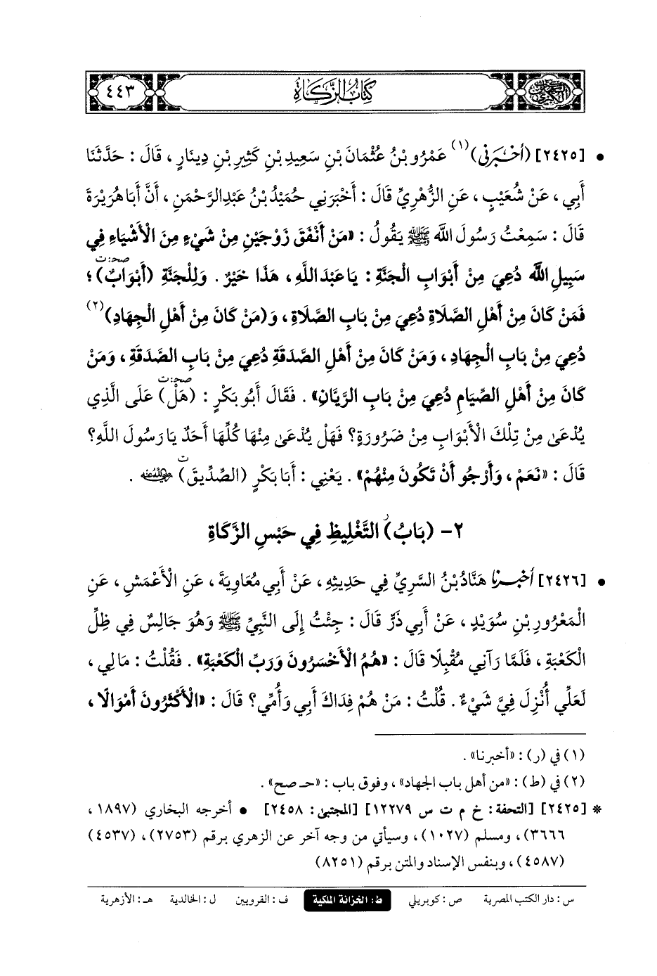 2425- أَخبَرني عَمرُو بنُ عُثْمَانَ بْنِ سَعِيدِ بْنِ كَثِيرِ بْنِ دِينَارٍ، قَالَ: حَدثنا أَبِي، عَنْ شُعَيبٍ، عَنِ الزُّهْرِيِّ، قَالَ: أَخبَرني حُمَيْدُ بنُ عَبدِ الرَّحْمَنِ، أَنَّ أَبَا هُرَيرَةَ، قَالَ: سَمِعْتُ رَسُولَ اللهِ صَلى الله عَليه وسَلم يَقُولُ: مَنْ أَنْفَقَ زَوْجَيْنِ مِنْ شَيْءٍ مِنَ الأَشْيَاءِ فِي سَبِيلِ اللهِ، دُعِيَ مِنْ أَبْوَابِ الجَنَّةِ، يَا عَبدَ اللهِ هَذَا خَيْرٌ، وَلِلْجَنَّةِ أَبْوَابٌ، فَمَنْ كَانَ مِنْ أَهْلِ الصَّلاَةِ، دُعِيَ مِنْ بَابِ الصَّلاَةِ، وَمَنْ كَانَ مِنْ أَهْلِ الجِهَادِ، دُعِيَ مِنْ بَابِ الجِهَادِ، وَمَنْ كَانَ مِنْ أَهْلِ الصَّدَقَةِ، دُعِيَ مِنْ بَابِ الصَّدَقَةِ، وَمَنْ كَانَ مِنْ أَهْلِ الصِّيَامِ، دُعِيَ مِنْ بَابِ الرَّيَّانِ، فَقَالَ أَبُو بَكْرٍ: هَلْ عَلَى الَّذِي يُدْعَى مِنْ تِلْكَ الأَبْوَابِ مِنْ ضَرُورَةٍ، فَهَلْ يُدْعَى مِنْهَا كُلِّهَا أَحَدٌ يَا رَسُولَ اللهِ؟ قَالَ: نَعَمْ، وَأَرْجُو أَنْ تَكُونَ مِنْهُمْ، يَعْنِي أَبَا بَكْرٍ الصديق رضي الله عنه.