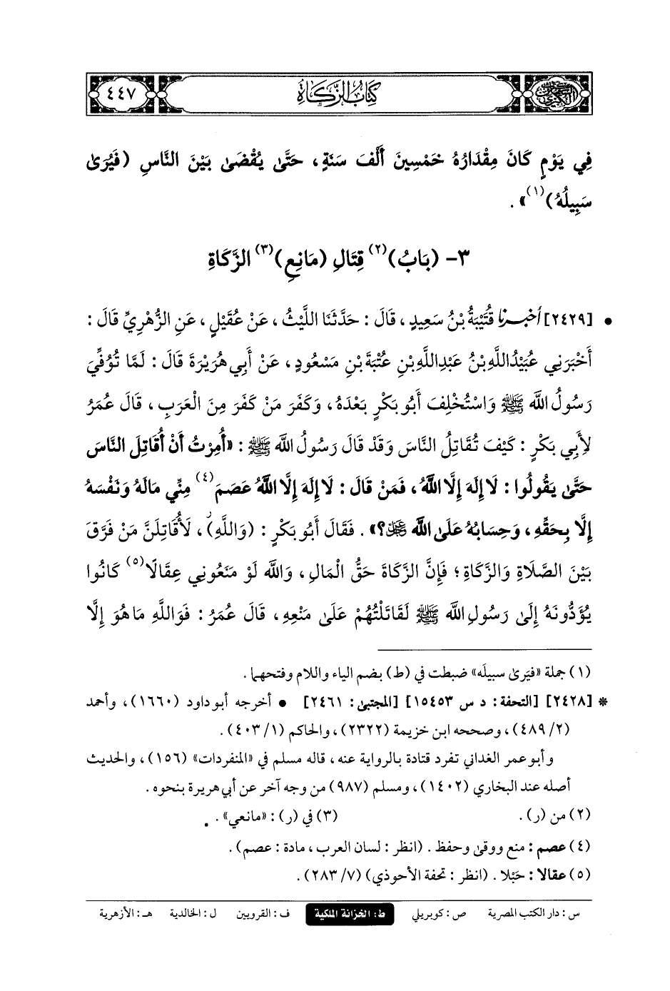 2429- أَخبَرنا قُتَيبَةُ بنُ سَعِيدٍ، قَالَ: حَدثنا اللَّيْثُ، عَنْ عُقَيْلٍ، عَنِ الزُّهْرِيِّ، قَالَ: أَخبَرني عُبَيدُ اللهِ بنُ عَبدِ اللهِ بْنِ عُتْبَةَ بْنِ مَسْعُودٍ، عَنْ أَبِي هُرَيرَةَ قَالَ: لَمَّا تُوُفِّيَ رَسُولُ اللهِ صَلى الله عَليه وسَلم، وَاسْتُخْلِفَ أَبُو بَكْرٍ بَعْدَهُ، وَكَفَرَ مَنْ كَفَرَ مِنَ العَرَبِ، قَالَ عُمَرُ لأَبِي بَكْرٍ: كَيْفَ تُقَاتِلُ النَّاسَ، وَقَدْ قَالَ رَسُولُ اللهِ صَلى الله عَليه وسَلم: أُمِرْتُ أَنْ أُقَاتِلَ النَّاسَ حَتَّى يَقُولُوا: لاَ إِلَهَ إِلاَّ اللهُ، فَمَنْ قَالَ: لاَ إِلَهَ إِلاَّ اللهُ، عَصَمَ مِنِّي مَالَهُ وَنَفْسَهُ إِلاَّ بِحَقِّهِ، وَحِسَابُهُ عَلَى اللهِ عز وجل ؟ فَقَالَ أَبُو بَكْرٍ: واللَّهِ لأُقَاتِلَنَّ مَنْ فَرَّقَ بَيْنَ الصَّلاَةِ وَالزَّكَاةِ، فَإِنَّ الزَّكَاةَ حَقُّ المَالِ، وَاللهِ لَو مَنَعُونِي عِقَالاً كَانُوا يُؤَدُّونَهُ إِلَى رَسُولِ اللهِ صَلى الله عَليه وسَلم لَقَاتَلْتُهُمْ عَلَى مَنْعِهِ، قَالَ عُمَرُ: فَوَاللَّهِ مَا هُو إِلاَّ أَنْ رَأَيْتُ اللهَ شَرَحَ صَدْرَ أَبِي بَكْرٍ لِلْقِتَالِ، فَعَرَفْتُ أَنَّهُ الحَقُّ.