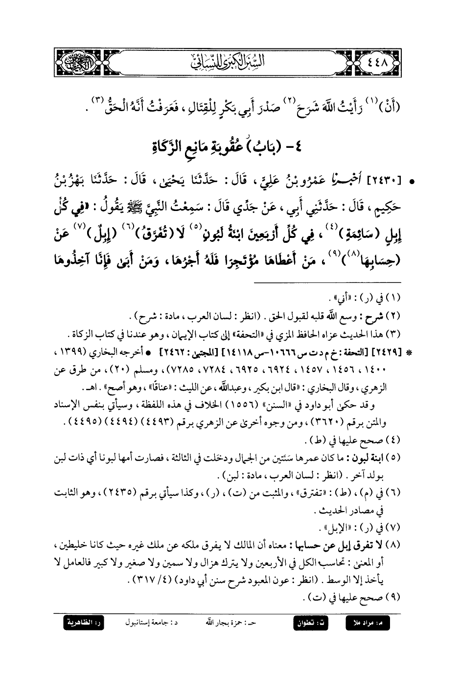 2430- أَخبَرنا عَمرُو بنُ عَلِيٍّ، قَالَ: حَدثنا يَحيَى، قَالَ: حَدثنا بَهْزُ بنُ حَكِيمٍ، قَالَ: حَدَّثَنِي أَبِي، عَنْ جَدِّي، قَالَ: سَمِعْتُ النَّبِيَّ صَلى الله عَليه وسَلم يَقُولُ: فِي كُلِّ إِبِلٍ سَائِمَةٍ فِي كُلِّ أَرْبَعِينَ ابنَةُ لَبُونٍ لاَ تُفَرَّقُ إِبِلٌ عَنْ حِسَابِهَا، مَنْ أَعْطَاهَا مُؤْتَجِرًا فَلَهُ أَجْرُهَا، وَمَنْ أَبَى فَإِنَّا آخِذُوهَا وَشَطْرَ إِبِلِهِ عَزْمَةً مِنْ عَزَمَاتِ رَبِّنَا، لاَ يَحِلُّ لآلِ مُحَمدٍ مِنْهَا شَيْءٌ.