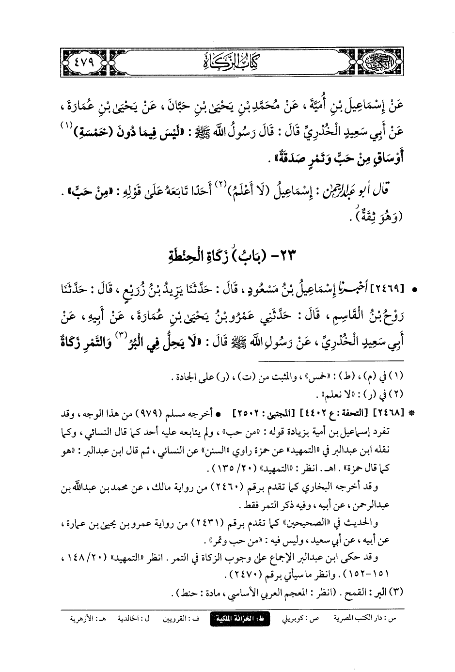 2469- أَخبَرنا إِسْمَاعِيلُ بنُ مَسْعُودٍ، قَالَ: حَدثنا يَزِيدُ بنُ زُرَيْعٍ، قَالَ: حَدثنا رَوْحُ بنُ القَاسِمِ، قَالَ: حَدَّثَنِي عَمرُو بنُ يَحيَى بْنِ عُمَارَةَ، عَنْ أَبِيهِ، عَنْ أَبِي سَعِيدٍ الخُدْرِيِّ، عَنْ رَسُولِ اللهِ صَلى الله عَليه وسَلم قَالَ: لاَ يَحِلُّ فِي البُرِّ وَالتَّمْرِ زَكَاةٌ حَتَّى يَبْلُغَ خَمْسَةَ أَوْسُقٍ، وَلاَ يَحِلُّ فِي الوَرِقِ زَكَاةٌ حَتَّى تَبْلُغَ خَمْسَ أَوَاقٍ، وَلاَ يَحِلُّ فِي الإِبِلٍ زَكَاةٌ حَتَّى تَبْلُغَ خَمْسَ ذَوْدٍ.