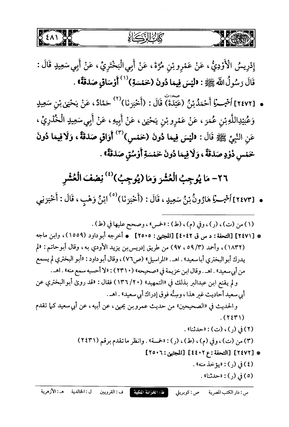 2472- أَخبَرنا أَحْمَدُ بنُ عَبدَةَ، قَالَ: أَخبَرنا حَمَّادٌ، عَنْ يَحيَى بْنِ سَعِيدٍ، وَعُبَيدُ اللهِ بنُ عُمَرَ، عَنْ عَمْرِو بْنِ يَحيَى، عَنْ أَبِيهِ، عَنْ أَبِي سَعِيدٍ الخُدْرِيِّ، عَنِ النَّبِيِّ صَلى الله عَليه وسَلم قَالَ: لَيْسَ فِيمَا دُونَ خَمْسِ أَوَاقٍ صَدَقَةٌ، وَلاَ فِيمَا دُونَ خَمْسِ ذَوْدٍ صَدَقَةٌ، وَلاَ فِيمَا دُونَ خَمْسَةِ أَوْسُقٍ صَدَقَةٌ.