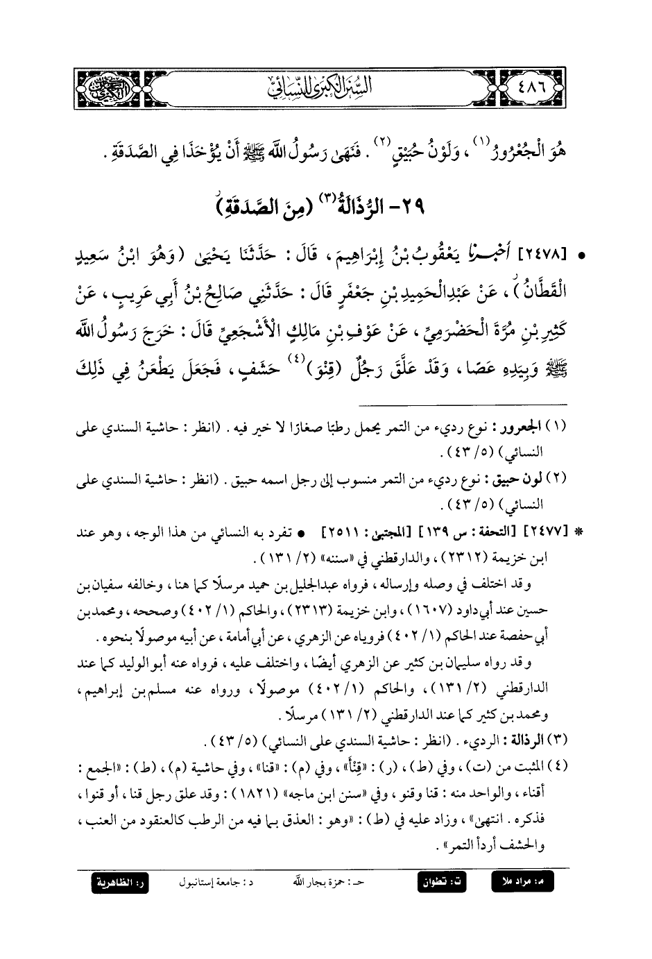 2478- أَخبَرنا يَعقُوبُ بنُ إِبرَاهِيمَ، قَالَ: حَدثنا يَحيَى، وَهُوَ ابنُ سَعِيدٍ القَطَّانُ، عَنْ عَبدِ الحَمِيدِ بْنِ جَعفَرٍ، قَالَ: حَدَّثَنِي صَالِحُ بنُ أَبِي عَرِيبٍ، عَنْ كَثِيرِ بْنِ مُرَّةَ الحَضْرَمِيِّ، عَنْ عَوْفِ بْنِ مَالِكٍ الأَشْجَعِيِّ قَالَ: خَرَجَ رَسُولُ اللهِ صَلى الله عَليه وسَلم وَبِيَدِهِ عَصًا، وَقَدْ عَلَّقَ رَجُلٌ قِنْوَ حَشَفٍ، فَجَعَلَ يَطْعُنُ فِي ذَلِكَ القِنْوِ، فَقَالَ: لَوْ شَاءَ رَبُّ هَذِهِ الصَّدَقَةِ تَصَدَّقَ بِأَطْيَبَ مِنْ هَذَا، إِنَّ رَبَّ هَذِهِ الصَّدَقَةِ يَأْكُلُ حَشَفًا يَوْمَ القِيَامَةِ.