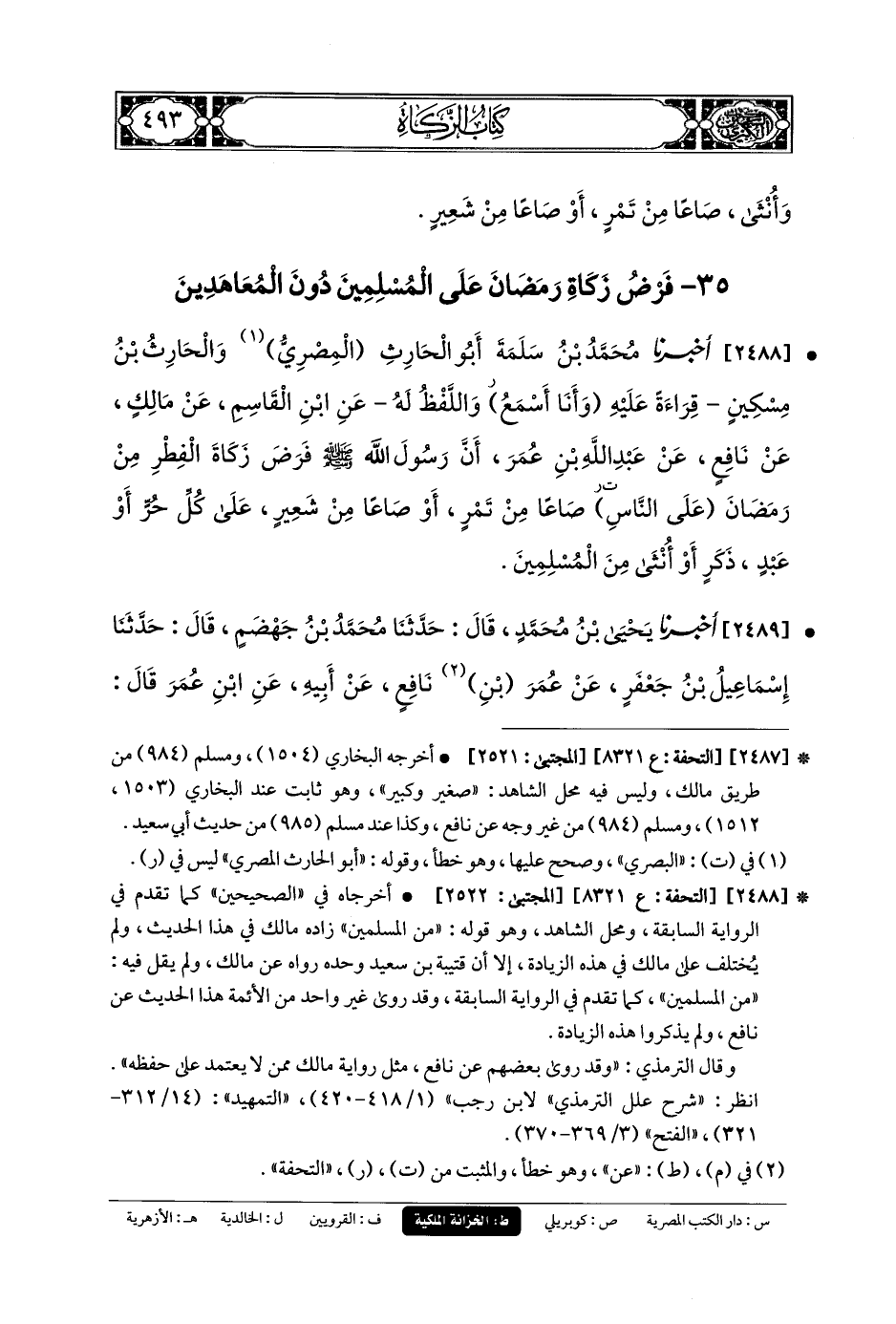 2488- أَخبَرنا مُحَمدُ بنُ سَلَمَةَ أَبُو الحَارِثِ المِصْرِيُّ، وَالحَارِثُ بنُ مِسْكِينٍ، قِرَاءَةً عَلَيْهِ، وَأَنَا أَسْمَعُ، وَاللَّفْظُ لَهُ، عَنِ ابنِ القَاسِمِ، عَنْ مَالِكٍ، عَنْ نَافِعٍ، عَنِ عَبدِ اللهِ بْنِ عُمَرَ، أَنَّ رَسُولَ اللهِ صَلى الله عَليه وسَلم فَرَضَ زَكَاةَ الفِطْرِ مِنْ رَمَضَانَ عَلَى النَّاسِ صَاعًا مِنْ تَمْرٍ أَوْ صَاعًا مِنْ شَعِيرٍ، عَلَى كُلِّ حُرٍّ أَوْ عَبدٍ، ذَكَرٍ أَوْ أُنْثَى مِنَ المُسْلِمِينَ.