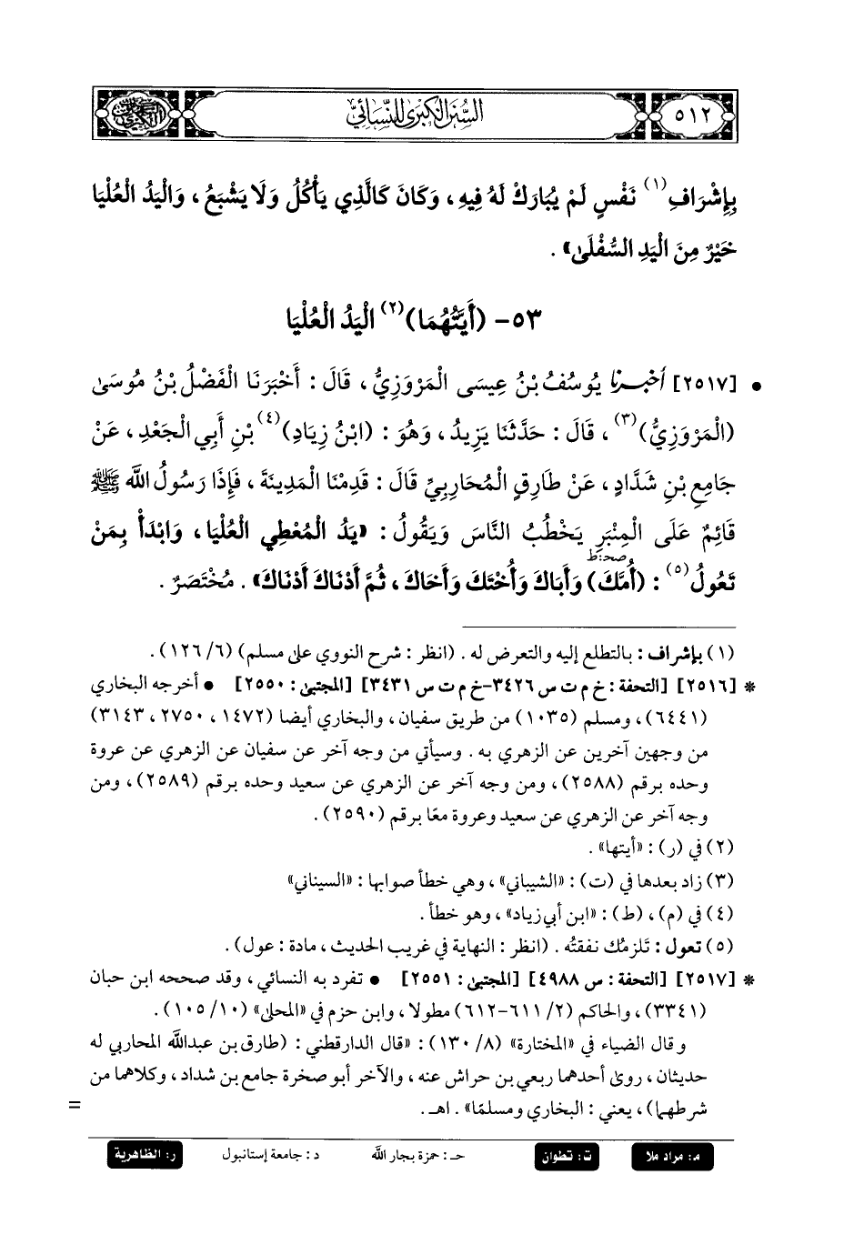 2517- أَخبَرنا يُوسُفُ بنُ عِيسَى المَرْوَزِيُّ، قَالَ: أَخبَرنا الفَضْلُ بنُ مُوسَى المَرْوَزِيُّ السِّينَانِيُّ، قَالَ: حَدثنا يَزِيدُ، وَهُوَ ابنُ زِيَادِ بْنِ أَبِي الجَعْدِ، عَنْ جَامِعِ بْنِ شَدَّادٍ، عَنْ طَارِقٍ المُحَارِبِيِّ قَالَ: قَدِمْنَا المَدِينَةَ، فَإِذَا رَسُولُ اللهِ صَلى الله عَليه وسَلم قَائِمٌ عَلَى المِنْبَرِ يَخْطُبُ النَّاسَ، وَيَقُولُ: يَدُ المُعْطِي العُلْيَا، وَابْدَأْ بِمَنْ تَعُولُ، أُمَّكَ وَأَبَاكَ وَأُخْتَكَ وَأَخَاكَ، ثُمَّ أَدْنَاكَ أَدْنَاكَ، مُخْتَصَرٌ.