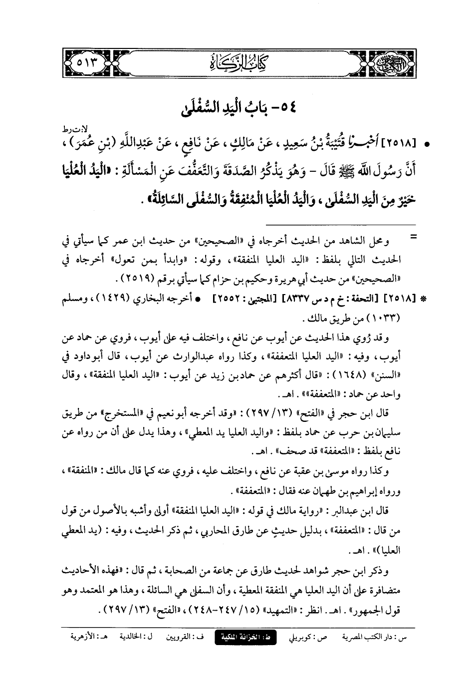 2518- أَخبَرنا قُتَيبَةُ بنُ سَعِيدٍ، عَنْ مَالِكٍ، عَنْ نَافِعٍ، عَنْ عَبدِ اللهِ بْنِ عُمَرَ، أَنَّ رَسُولَ اللهِ صَلى الله عَليه وسَلم قَالَ وَهُوَ يَذْكُرُ الصَّدَقَةَ، وَالتَّعَفُّفَ عَنِ المَسْأَلَةِ: اليَدُ العُلْيَا خَيْرٌ مِنَ اليَدِ السُّفْلَى، وَاليَدُ العُلْيَا المُنْفِقَةُ وَالسُّفْلَى السَّائِلَةُ.