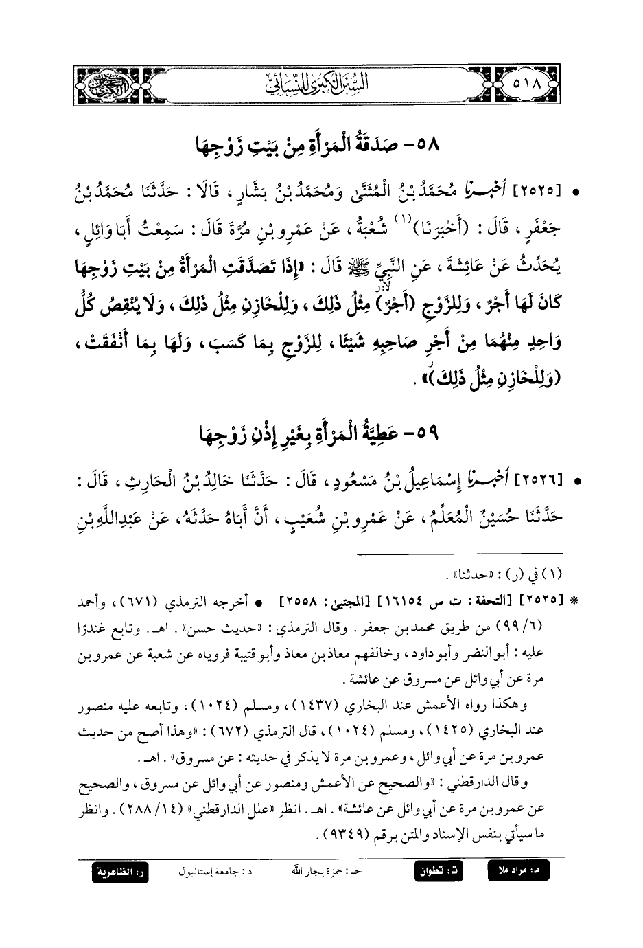 2525- أَخبَرنا مُحَمدُ بنُ المُثَنَّى، وَمُحَمدُ بنُ بَشَّارٍ، قَالاَ: حَدثنا مُحَمدُ بنُ جَعفَرٍ، قَالَ: حَدثنا شُعبَةُ، عَنْ عَمْرِو بْنِ مُرَّةَ، قَالَ: سَمِعْتُ أَبَا وَائِلٍ يُحَدِّثُ عَنْ عَائِشَةَ، عَنِ النَّبِيِّ صَلى الله عَليه وسَلم، قَالَ: إِذَا تَصَدَّقَتِ المَرْأَةُ مِنْ بَيْتِ زَوْجِهَا كَانَ لَهَا أَجْرٌ، وَلِلزَّوْجِ أَجْرٌ مِثْلُ ذَلِكَ، وَلِلْخَازِنِ مِثْلُ ذَلِكَ، وَلاَ يَنْقُصُ كُلُّ وَاحِدٍ مِنْهُمَا مِنْ أَجْرِ صَاحِبِهِ شَيْئًا، لِلزَّوْجِ بِمَا كَسَبَ، وَلَهَا بِمَا أَنْفَقَتْ, وَلِلْخَازِنِ مِثْلُ ذَلِكَ.