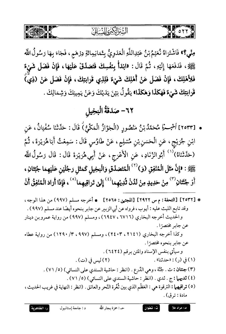 2533- أَخبَرنا مُحَمدُ بنُ مَنصُورٍ الجَوَّازُ المَكِّيُّ، قَالَ: حَدثنا سُفْيَانُ، عَنِ ابنِ جُرَيْجٍ، عَنِ الحَسَنِ بْنِ مُسْلِمٍ، عَنْ طَاوُوسٍ، قَالَ: سَمِعْتُ أَبَا هُرَيرَةَ، ثُمَّ حَدثناهُ أَبُو الزِّنَادِ، عَنِ الأَعْرَجِ، عَنْ أَبِي هُرَيرَةَ قَالَ: قَالَ رَسُولُ اللهِ صَلى الله عَليه وسَلم: إِنَّ مَثَلَ المُنْفِقِ وَالمُتَصَدِّقِ وَالبَخِيلِ كَمَثَلِ رَجُلَيْنِ عَلَيْهِمَا جُبَّتَانِ أَوْ جُنَّتَانِ مِنْ حَدِيدٍ مِنْ لَدُنْ ثُدِيِّهِمَا إِلَى تَرَاقِيهِمَا، فَإِذَا أَرَادَ المُنْفِقُ أَنْ يُنْفِقَ اتَّسَعَتْ عَلَيْهِ الدِّرْعُ أَوْ مَرَّتْ، حَتَّى تُجِنَّ بَنَانَهُ وَتَعْفُوَ أَثَرَهُ، وَإِذَا أَرَادَ البَخِيلُ أَنْ يُنْفِقَ قَلَصَتْ وَلَزِمَتْ كُلُّ حَلْقَةٍ مَوْضِعَهَا، حَتَّى أَخَذَتْ بِتَرْقُوَتِهِ أَوْ بِرَقَبَتِهِ، يَقُولُ أَبُو هُرَيرَةَ: أَشْهَدُ أَنَّهُ رَأَى رَسُولَ اللهِ صَلى الله عَليه وسَلم كَذَا قَالَ: يُوَسِّعُهَا وَلاَ تَتَّسِعُ.