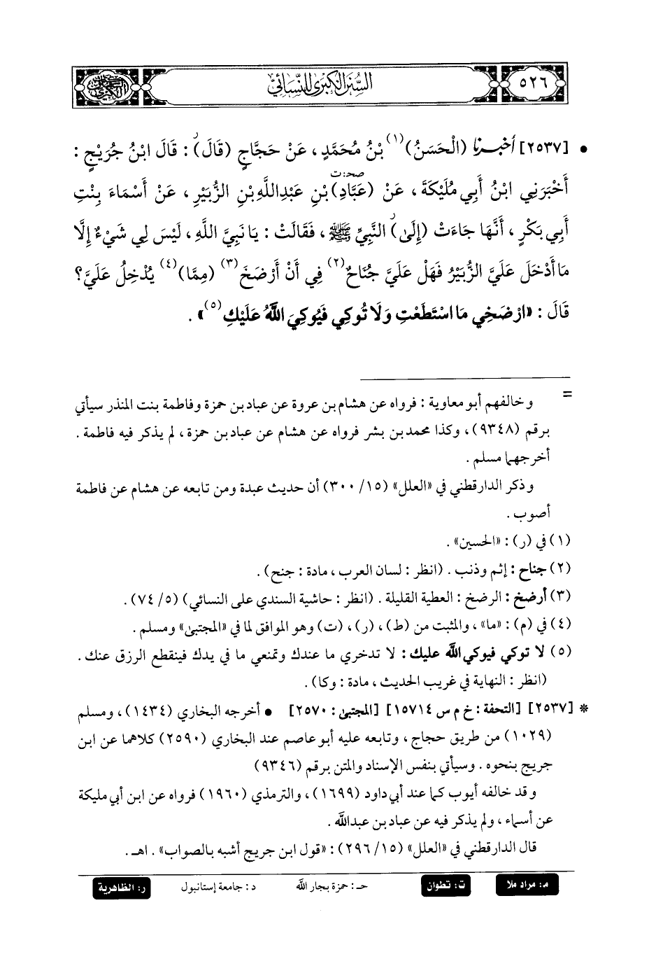 2537- أَخبَرنا الحَسَنُ بنُ مُحَمدٍ، عَنْ حَجَّاجٍ قال: قَالَ ابنُ جُرَيْجٍ: أَخبَرني ابنُ أَبِي مُلَيْكَةَ، عَنْ عَبَّادِ بْنِ عَبدِ اللهِ بْنِ الزُّبَيْرِ، عَنْ أَسْمَاءَ بِنْتِ أَبِي بَكْرٍ، أَنَّهَا جَاءَتِ إلى النَّبِيَّ صَلى الله عَليه وسَلم فَقَالَتْ: يَا نَبِيَّ اللهِ، لَيْسَ لِي شَيْءٌ إِلاَّ مَا أَدْخَلَ عَلَيَّ الزُّبَيْرُ، فَهَلْ عَلَيَّ جُنَاحٌ فِي أَنْ أَرْضَخَ مِمَّا يُدْخِلُ عَلَيَّ، قَالَ: ارْضَخِي مَا اسْتَطَعْتِ، وَلاَ تُوكِي فَيُوكِيَ اللهُ عَلَيْكِ.