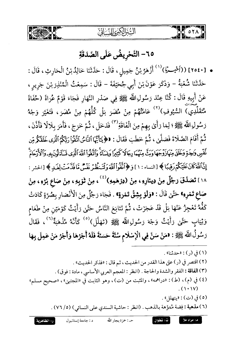 2540- أَخبَرنا أَزْهَرُ بنُ جَمِيلٍ، قَالَ: حَدثنا خَالِدُ بنُ الحَارِثِ، قَالَ: حَدثنا شُعبَةُ، وَذَكَرَ عَوْنُ بنُ أَبِي جُحَيْفَةَ، قَالَ: سَمِعْتُ المُنْذِرَ بْنَ جَرِيرٍ، عَنْ أَبِيهِ، قَالَ: كُنَّا عِنْدَ رَسُولِ اللهِ صَلى الله عَليه وسَلم فِي صَدْرِ النَّهَارِ، فَجَاءَ قَوْمٌ عُرَاةٌ حُفَاةٌ، مُتَقَلِّدِي السُّيُوفِ، عَامَّتُهُمْ مِنْ مُضَرَ بَلْ كُلُّهُمْ مِنْ مُضَرَ، فَتَغَيَّرَ وَجْهُ رَسُولِ اللهِ صَلى الله عَليه وسَلم لِمَا رَأَى بِهِمْ مِنَ الفَاقَةِ، فَدَخَلَ، ثُمَّ خَرَجَ، فَأَمَرَ بِلاَلاً، فَأَذَّنَ، ثُمَّ أَقَامَ الصَّلاَةَ فَصَلَّى، ثُمَّ خَطَبَ فَقَالَ: {يَا أَيُّهَا النَّاسُ اتَّقُوا رَبَّكُمُ الَّذِي خَلَقَكُمْ مِنْ نَفْسٍ وَاحِدَةٍ وَخَلَقَ مِنْهَا زَوْجَهَا وَبَثَّ مِنْهُمَا رِجَالاً كَثِيرًا وَنِسَاءً وَاتَّقُوا اللهَ الَّذِي تَسَاءَلُونَ بِهِ وَالأَرْحَامَ إِنَّ اللهَ كَانَ عَلَيْكُمْ رَقِيبًا}، وَ{اتَّقُوا اللهَ وَلْتَنْظُرْ نَفْسٌ مَا قَدَّمَتْ لِغَدٍ} تَصَدَّقَ رَجُلٌ مِنْ دِينَارِهِ، مِنْ درهمِهِ، مِنْ ثَوْبِهِ، مِنْ صَاعِ بُرِّهِ، مِنْ صَاعِ تَمْرِهِ، حَتَّى قَالَ: وَلَوْ بِشِقِّ تَمْرَةٍ، فَجَاءَ رَجُلٌ مِنَ الأَنْصَارِ بِصُرَّةٍ كَادَتْ كَفُّهُ تَعْجِزُ عَنْهَا، بَلْ قَدْ عَجَزَتْ، ثُمَّ تَتَابَعَ النَّاسُ، حَتَّى رَأَيْتُ كَوْمَيْنِ مِنْ طَعَامٍ وَثِيَابٍ، حَتَّى رَأَيْتُ وَجْهَ رَسُولِ اللهِ صَلى الله عَليه وسَلم تتَهَلَّلُ كَأَنَّهُ مُذْهَبَةٌ، فَقَالَ رَسُولُ اللهِ صَلى الله عَليه وسَلم: مَنْ سَنَّ فِي الإِسْلاَمِ سُنَّةً حَسَنَةً فَلَهُ أَجْرُهَا وَأَجْرُ مَنْ عَمِلَ بِهَا مِنْ غَيْرِ أَنْ يَنْتَقِصَ مِنْ أُجُورِهِمْ شَيْئًا، وَمَنْ سَنَّ فِي الإِسْلاَمِ سُنَّةً سَيِّئَةً فَعَلَيْهِ وِزْرُهَا وَوِزْرُ مَنْ يَعْمَلُ بِهَا مِنْ غَيْرِ أَنْ يَنْتَقِصَ مِنْ أَوْزَارِهِمْ شَيْئًا.