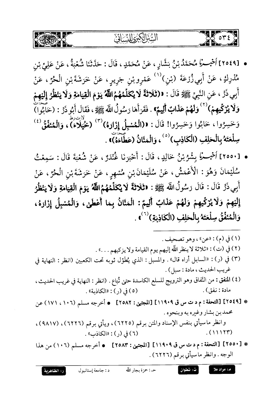 2550- أَخبَرنا بِشْرُ بنُ خَالِدٍ، قَالَ: أَخبَرنا غُنْدَرٌ، عَنْ شُعبَةَ، قَالَ: سَمِعْتُ سُلَيمَانَ، وَهُوَ الأَعْمَشُ، عَنْ سُلَيمَانَ بْنِ مُسْهِرٍ، عَنْ خَرَشَةَ بْنِ الحُرِّ، عَنْ أَبِي ذَرٍّ قَالَ: قَالَ رَسُولُ اللهِ صَلى الله عَليه وسَلم: ثَلاَثَةٌ لاَ يُكَلِّمُهُمُ اللهُ يَوْمَ القِيَامَةِ، وَلاَ يَنْظُرُ إِلَيْهِمْ، وَلاَ يُزَكِّيهِمْ وَلَهُمْ عَذَابٌ أَلِيمٌ: المَنَّانُ بِمَا أَعْطَى، وَالمُسْبِلُ إِزَارَهُ، وَالمُنَفِّقُ سِلْعَتَهُ بِالحَلِفِ الكَاذِبِة.