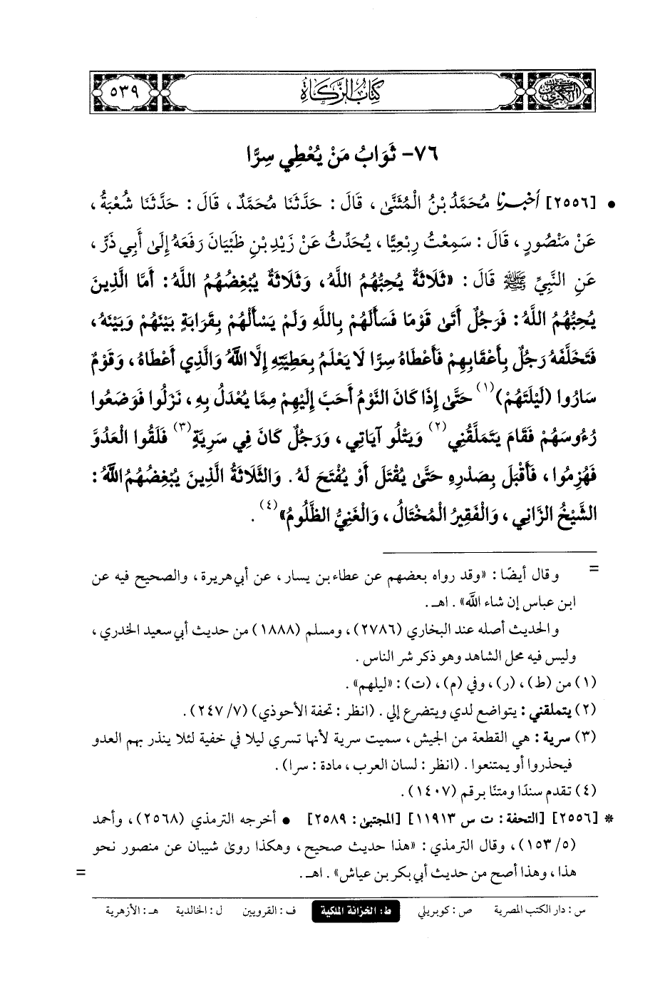 2556- أَخبَرنا مُحَمدُ بنُ المُثَنَّى، قَالَ: حَدثنا مُحَمدٌ، قَالَ: حَدثنا شُعبَةُ، عَنْ مَنصُورٍ، قَالَ: سَمِعْتُ رِبْعِيًّا يُحَدِّثُ عَنْ زَيْدِ بْنِ ظَبْيَانَ، رَفَعَهُ إِلَى أَبِي ذَرٍّ، عَنِ النَّبِيِّ صَلى الله عَليه وسَلم قَالَ: ثَلاَثَةٌ يُحِبُّهُمُ اللهُ، وَثَلاَثَةٌ يُبْغِضُهُمُ اللهُ، أَمَّا الَّذِينَ يُحِبُّهُمُ اللهُ: فَرَجُلٌ أَتَى قَوْمًا فَسَأَلَهُمْ بِاللهِ، وَلَمْ يَسْأَلْهُمْ بِقَرَابَةٍ بَيْنَهُمْ وَبَيْنَهُ، فَتَخَلَّفَهُ رَجُلٌ بِأَعْقَابِهِمْ فَأَعْطَاهُ سِرًّا لاَ يَعْلَمُ بِعَطِيَّتِهِ إِلاَّ اللهُ وَالَّذِي أَعْطَاهُ، وَقَوْمٌ سَارُوا لَيْلَتَهُمْ حَتَّى إِذَا كَانَ النَّوْمُ أَحَبَّ إِلَيْهِمْ مِمَّا يُعْدَلُ بِهِ، نَزَلُوا فَوَضَعُوا رُؤوسَهُمْ، فَقَامَ يَتَمَلَّقُنِي وَيَتْلُو آيَاتِي، وَرَجُلٌ كَانَ فِي سَرِيَّةٍ فَلَقُوا العَدُوَّ فَهُزِمُوا، فَأَقْبَلَ بِصَدْرِهِ حَتَّى يُقْتَلَ أَوْ يُفْتَحَ لَهُ، وَالثَّلاَثَةُ الَّذِينَ يَبْغُضُهُمُ اللهُ: الشَّيْخُ الزَّانِي، وَالفَقِيرُ المُخْتَالُ، وَالغَنِيُّ الظَّلُومُ.