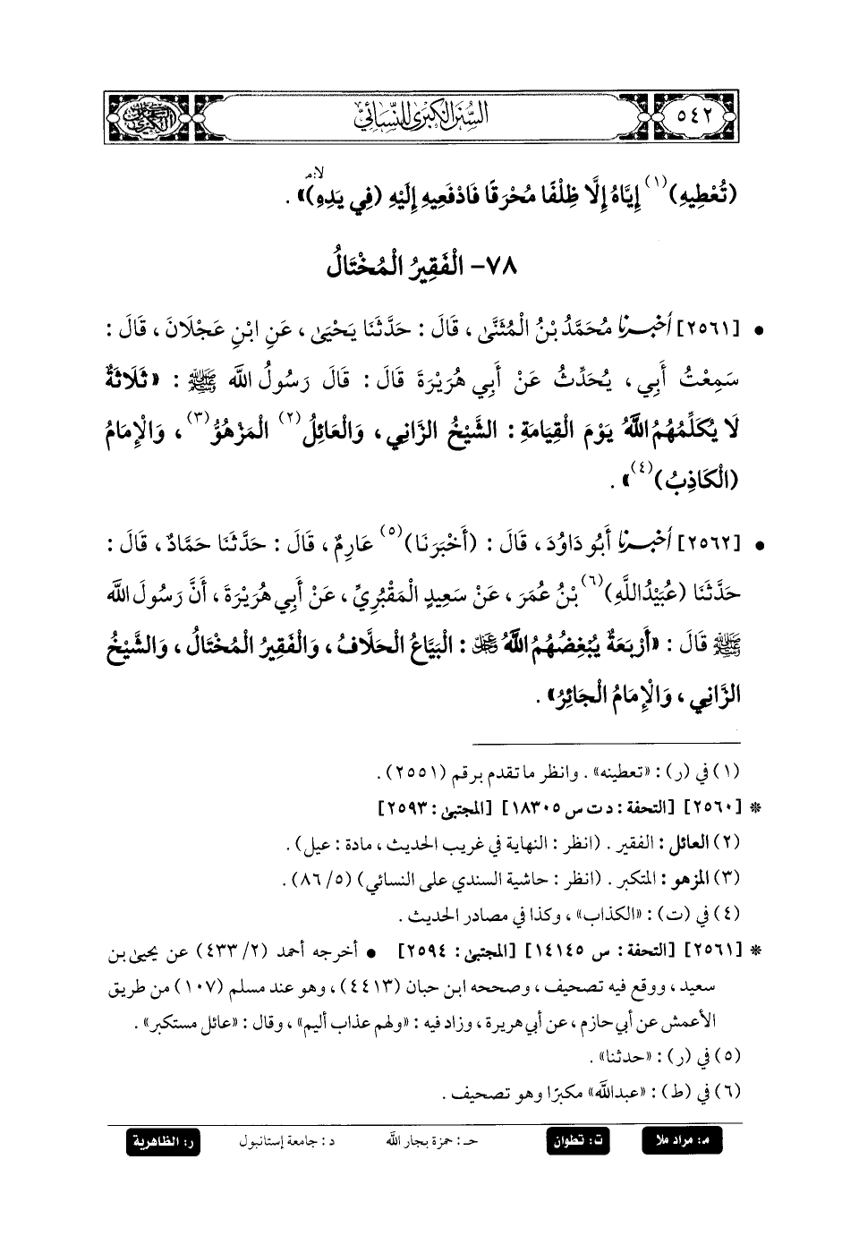 2562- أَخبَرنا أَبُو دَاوُدَ، قَالَ: أَخبَرنا عَارِمٌ، قَالَ: حَدثنا حَمَّادٌ، قَالَ: حَدثنا عُبَيدُ اللهِ بنُ عُمَرَ، عَنْ سَعِيدٍ المَقْبُرِيِّ، عَنْ أَبِي هُرَيرَةَ، أَنَّ رَسُولَ اللهِ صَلى الله عَليه وسَلم قَالَ: أَرْبَعَةٌ يُبْغِضُهُمُ اللهُ عز وجل: البَيَّاعُ الحَلاَّفُ، وَالفَقِيرُ المُخْتَالُ، وَالشَّيْخُ الزَّانِي، وَالإِمَامُ الجَائِرُ.