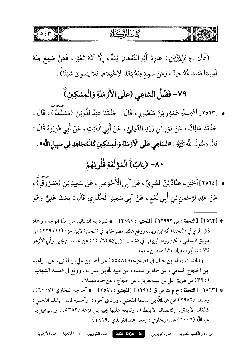 2563- أَخبَرنا عَمرُو بنُ مَنصُورٍ، قَالَ: حَدثنا عَبدُ اللهِ بنُ مَسْلَمَةَ، قَالَ: حَدثنا مَالِكٌ، عَنْ ثَوْرِ بْنِ زَيْدٍ الدِّيلِيِّ، عَنْ أَبِي الغَيْثِ، عَنْ أَبِي هُرَيرَةَ، قَالَ: قَالَ رَسُولُ اللهِ صَلى الله عَليه وسَلم: السَّاعِي عَلَى الأَرْمَلَةِ وَالمِسْكِينِ كَالمُجَاهِدِ فِي سَبِيلِ اللهِ.