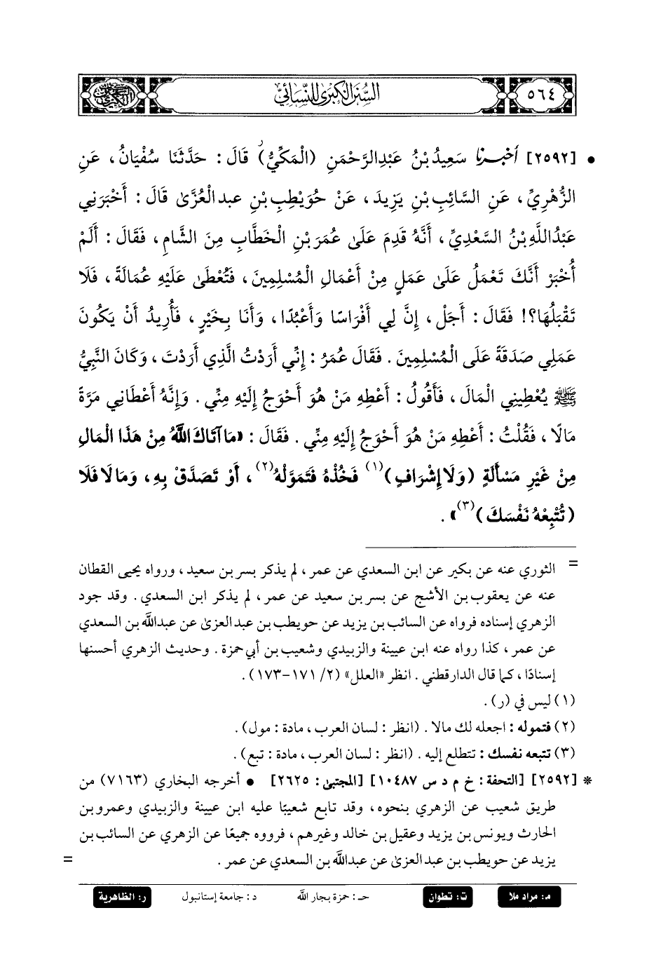 2592- أَخبَرنا سَعِيدُ بنُ عَبدِ الرَّحْمَنِ المَكِّيُّ، قَالَ: حَدثنا سُفْيَانُ، عَنِ الزُّهْرِيِّ، عَنِ السَّائِبِ بْنِ يَزِيدَ، عَنْ حُوَيْطِبِ بْنِ عَبدِ العُزَّى، قَالَ: أَخبَرني عَبدُ اللهِ بنُ السَّعْدِيِّ، أَنَّهُ قَدِمَ عَلَى عُمَرَ بْنِ الخَطَّابِ مِنَ الشَّامِ، فَقَالَ: أَلَمْ أُخْبَرْ أَنَّكَ تَعْمَلُ عَلَى عَمَلٍ مِنْ أَعْمَالِ المُسْلِمِينَ فَتُعْطَى عَلَيْهِ عُمَالَةً فَلاَ تَقْبَلُهَا؟ فَقَالَ: أَجَلْ، إِنَّ لِي أَفْرَاسًا وَأَعْبُدًا وَأَنَا بِخَيْرٍ، فَأُرِيدُ أَنْ يَكُونَ عَمَلِي صَدَقَةً عَلَى المُسْلِمِينَ، فَقَالَ عُمَرُ: إِنِّي أَرَدْتُ الَّذِي أَرَدْتَ، وَكَانَ النَّبِيُّ صَلى الله عَليه وسَلم يُعْطِينِي المَالَ، فَأَقُولُ: أَعْطِهِ مَنْ هُوَ أَحْوَجُ إِلَيْهِ مِنِّي، وَإِنَّهُ أَعْطَانِي مَرَّةً مَالاً، فَقُلْتُ: أَعْطِهِ مَنْ هُوَ أَحْوَجُ إِلَيْهِ مِنِّي، فَقَالَ: مَا آتَاكَ اللهُ مِنْ هَذَا المَالِ مِنْ غَيْرِ مَسْأَلَةٍ وَلاَ إِشْرَافٍ، فَخُذْهُ فَتَمَوَّلْهُ أَوْ تَصَدَّقْ بِهِ، وَمَا لاَ فَلاَ تُتْبِعْهُ نَفْسَكَ.