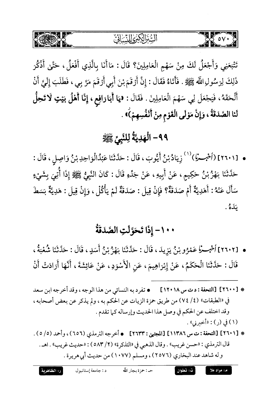 2601- أَخبَرنا زِيَادُ بنُ أَيُّوبَ، قَالَ: حَدثنا عَبدُ الوَاحِدِ بنُ وَاصِلٍ، قَالَ: حَدثنا بَهْزُ بنُ حَكِيمٍ، عَنْ أَبِيهِ، عَنْ جَدِّهِ قَالَ: كَانَ النَّبِيُّ صَلى الله عَليه وسَلم إِذَا أُتِيَ بِشَيْءٍ سَأَلَ عَنْهُ: أَهَدِيَّةٌ أَمْ صَدَقَةٌ؟ فَإِنْ قِيلَ: صَدَقَةٌ، لَمْ يَأْكُلْ، وَإِنْ قِيلَ: هَدِيَّةٌ، بَسَطَ يَدَهُ.