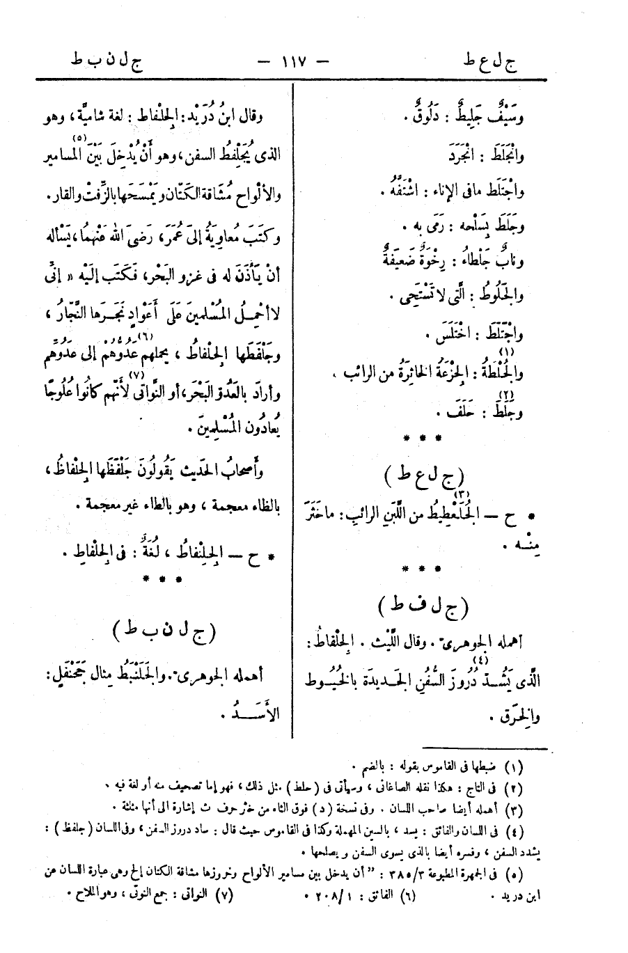 وقال ابنُ دريد: الجِلْفاط: لغة شاميَّة، وهو الذي يُجَلْفِطُ السُّفَنَ، وهو أَنْ يُدْخِلَ بَيْنَ المسامير والألْواح مُشَاقة الكَتّان ويَمْسَحَها بالزِّفْت والقار. وكتَبَ مُعاوِيَةُ إلَى عُمَرَ، رَضيَ الله عَنْهُما، يَسْأله أنْ يَأذَنَ له غزو البَحْر، فكَتَبَ إلَيْه: " إنِّي لا أحْمِلُ المُسْلمينَ عَلَى أَعْوَادٍ نَجَرَها النَّجّارُ، وجَلْفَطَها الجِلْفاطُ، يحملهم عَدُوُّهُمْ إلى عَدُوِّهم " وأرادَ بالعَدُوّ البَحْرَ، أو النَّواتيَّ لأَنّهم كانُوا عُلُوجًا يُعادُون المُسْلِمينَ.