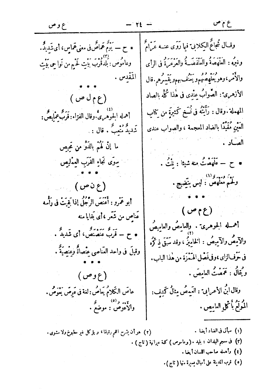 * ح - يَوْمٌ عَماصٌ في معنى عَماسٍ، أي شَدِيدٌ. وعامُوص: بَلد قُرْبَ بَيْتِ لَحْمٍ من نَواحِي بَيْتِ المَقْدِس.