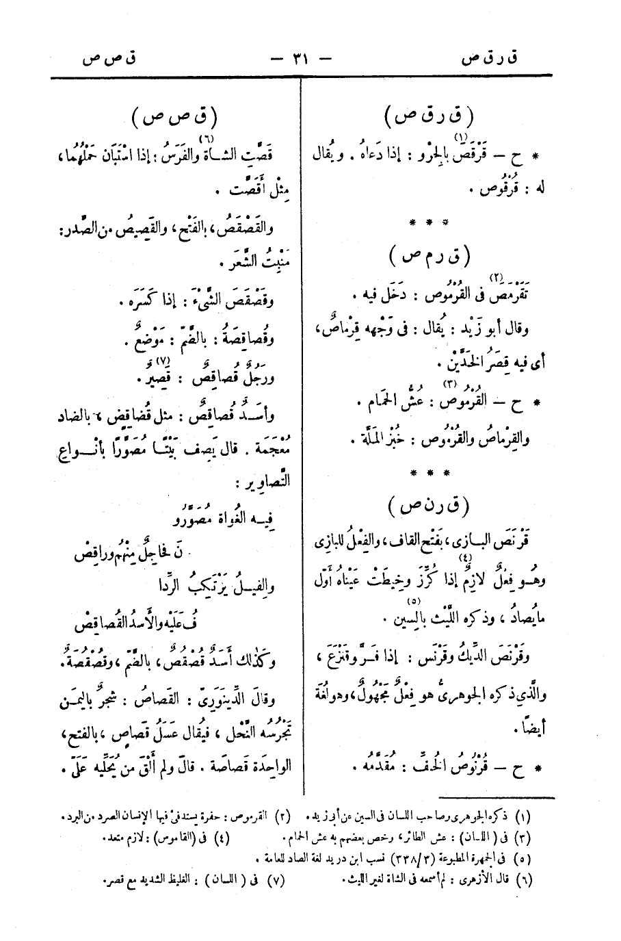 قَرْنَصَ البازي، بفَتْح القاف، والفِعْلُ للبازِي وهُو فِعْلٌ لازِمٌ إذا كُرِّزَ وخِيطَتْ عَيْناهُ أَوّل ما يُصادُ، وذكره اللَّيْثُ بالسِّين.