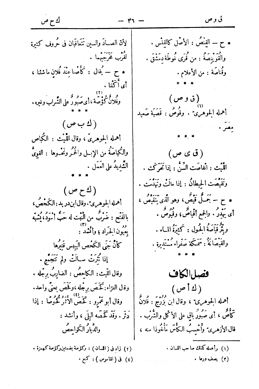 قال الأزهريّ: وأَحْسِبُ الكأْسَ مَأْخُوذا منه، لأنّ الصادَ والسين تَتَعاقَبان في حُروف كثيرة لقُرْب مَخْرَجَيْهما.