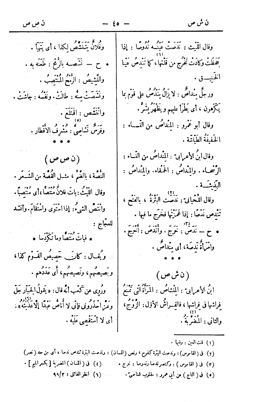 وقال اللِّحْيانيّ: نَدَصَت البَثْرَةُ، بالفَتْح، تَنْدِص نَدْصًا: إذا غَمَزْتَها فخَرَج ما فيها.