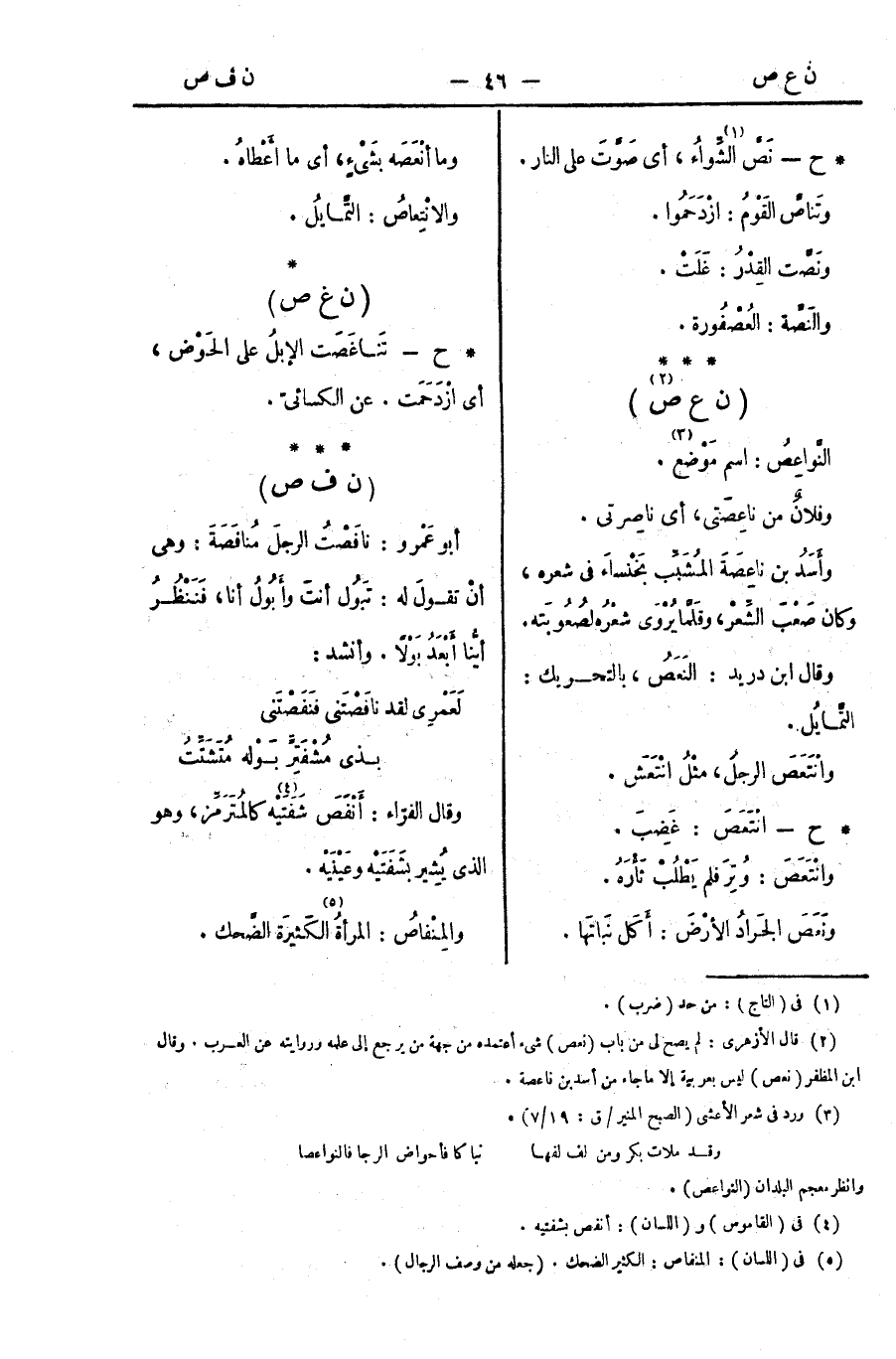 أبو عَمْرو: نافَصْتُ الرجلَ مُنافَصَةً: وهي أنْ تقولَ له: تَبُول أنتَ وأَبُولُ أنا، فنَنْظُرُ أيُّنا أَبْعَدُ بَوْلًا. وأنشد: