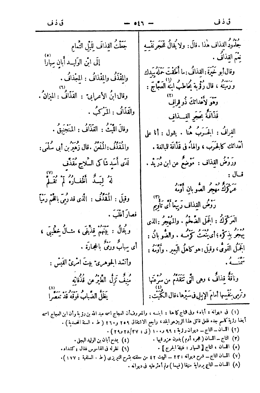 وقال ابنُ الأعرابيّ: القَذّافُ: المِيزانُ. والقَذّافُ: المَرْكبُ.