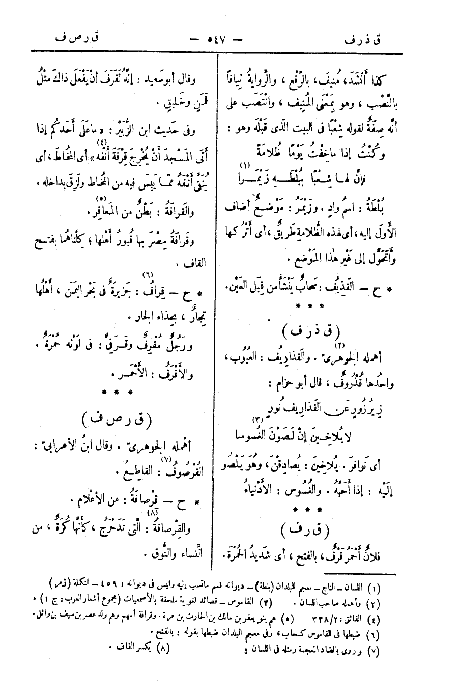 أهمله الجوهريّ. والقَذارِيفُ: العُيُوبُ، واحِدُها قُذْرُوفٌ، قال أبو حزام: