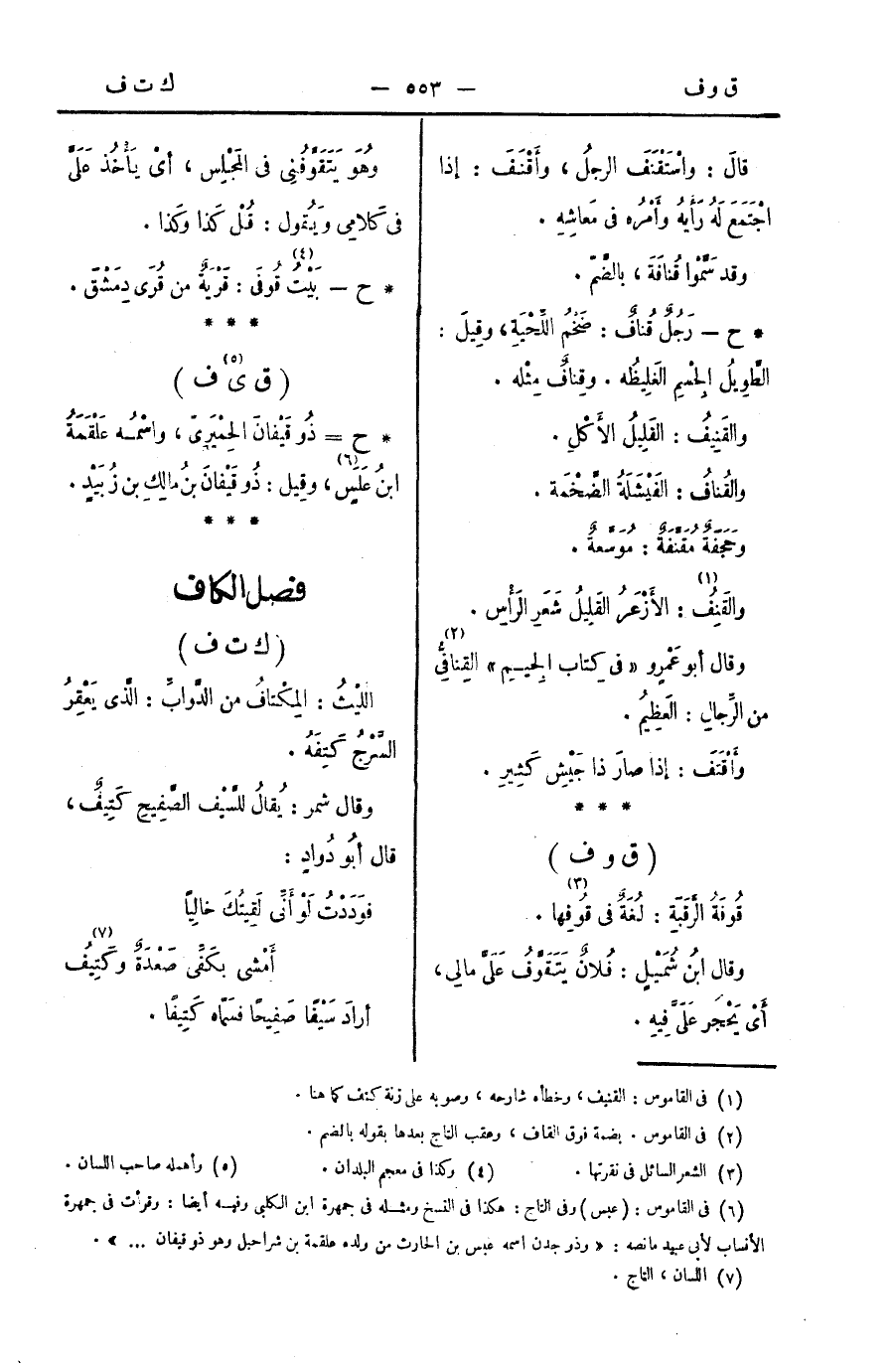 * ح - رَجُلٌ قُنافٌ: ضَخْمُ اللِّحْيَةِ، وقِيلَ: الطَّوِيلُ الجِسْمِ الغَلِيظُه. وقِنافٌ مِثْلُه.