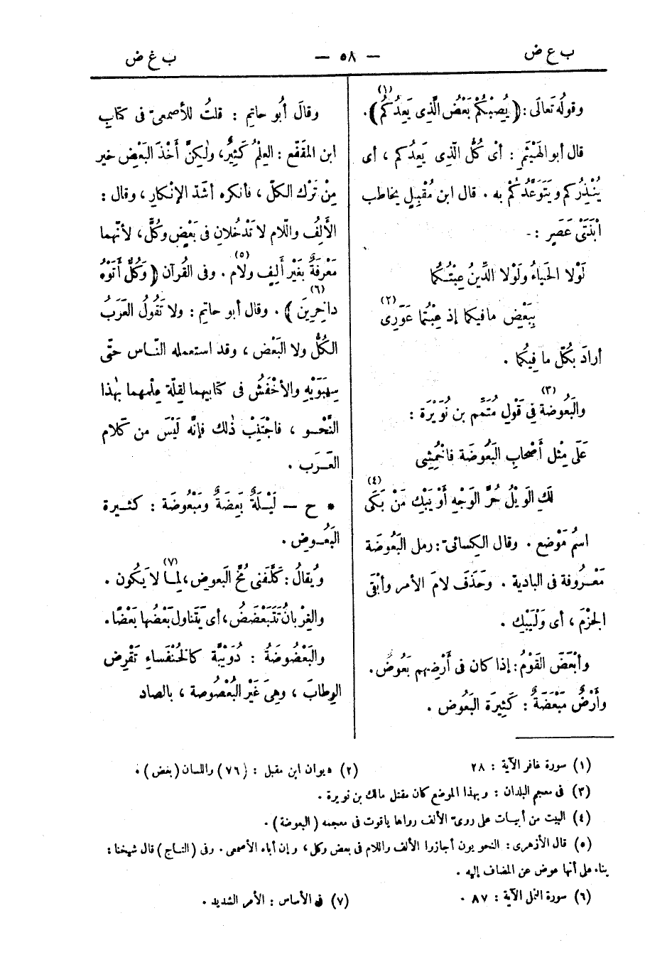 وقالَ أبُو حاتِم: قلتُ للأصمعيّ في كتابِ ابن المقَفّع: العِلْمُ كَثِيرٌ، ولَكِنَّ أَخْذَ البَعْضِ خير مِنْ تَرْك الكلّ، فأنكره أشَدّ الإنْكارِ، وقال: الأَلِفُ واللّام لا تَدْخُلانِ في بَعْضٍ وكُلٍّ، لأنّهما مَعْرِفَةٌ بغَيْر أَلِفٍ ولام. وفي القُرآن: (وَكُلٌّ أَتَوْهُ داخِرِينَ). وقال أبو حاتِم: ولا تَقُولُ العَرَبُ: الكُلُّ ولا البَعْض، وقد استعمله النّاس حتّى سِيبَوَيْهِ والأخْفَشُ في كتابيهما لقِلّة عِلْمهما بهذا النَّحْو، فاجْتَنِبْ ذلك فإنَّه لَيْسَ من كَلام العَرَب.