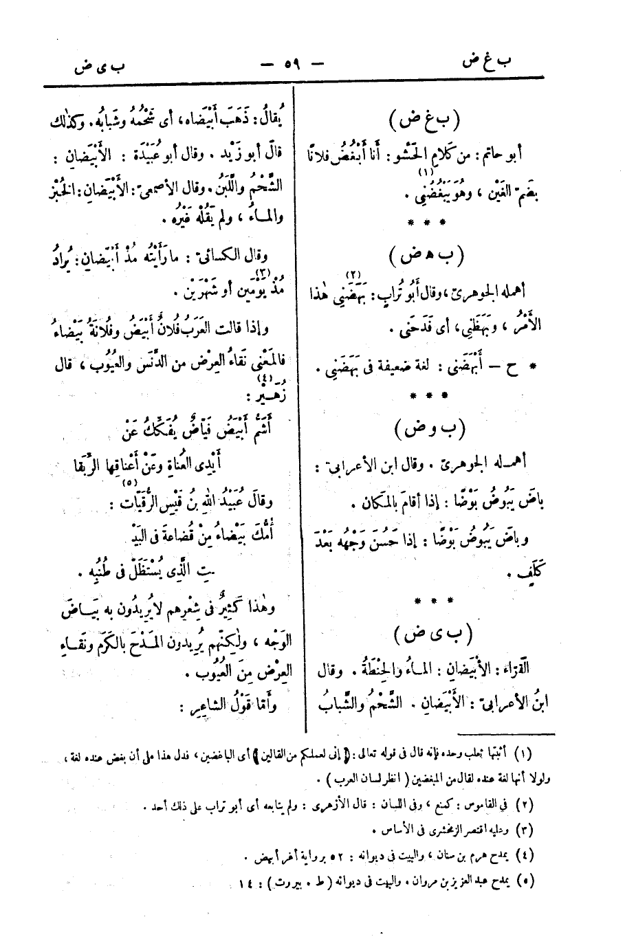 الفَرّاء: الأبْيَضانِ: الماءُ والحِنْطَةُ. وقال ابنُ الأعرابيّ: الأَبْيَضانِ. الشَّحْمُ والشَّبابُ. يُقالُ: ذَهَبَ أَبْيَضاه، أشي شَحْمُهُ وشَبابُه. وكذلك قالَ أبو زَيْد. وقال أبو عُبَيْدَة: الأَبْيَضانِ: الشَّحْمُ واللَّبَنُ. وقال الأصمعيّ: الأَبْيَضانِ: الخُبْز والماءُ، ولم يَقُلْه غَيْرُه.