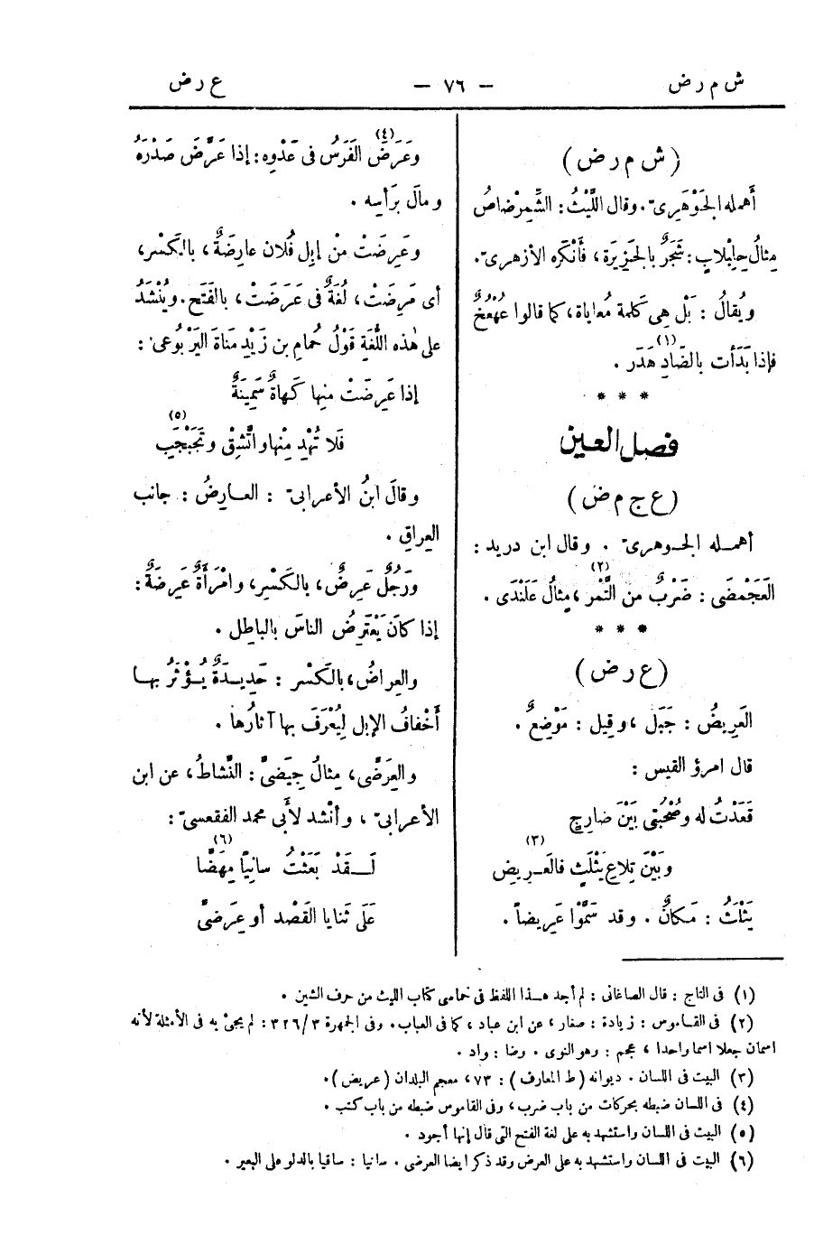 وعَرِضَتْ منْ إبلِ فُلان عارِضَةٌ، بالكَسْر، أي مَرِضَتْ، لُغَةٌ في عَرَضَتْ، بالفَتْح. ويُنْشَدُ على هذه اللُّغَةِ قَوْلُ حُمامِ بن زَيْدِ مَناةَ اليَرْبُوعي:
