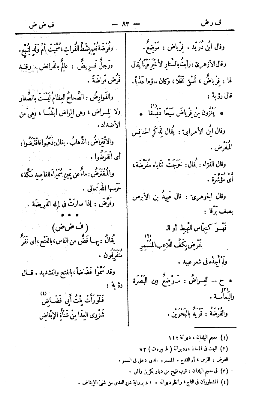* ح - الفِراضُ: مَوْضِعٌ بين البَصْرَة واليَمامَة.