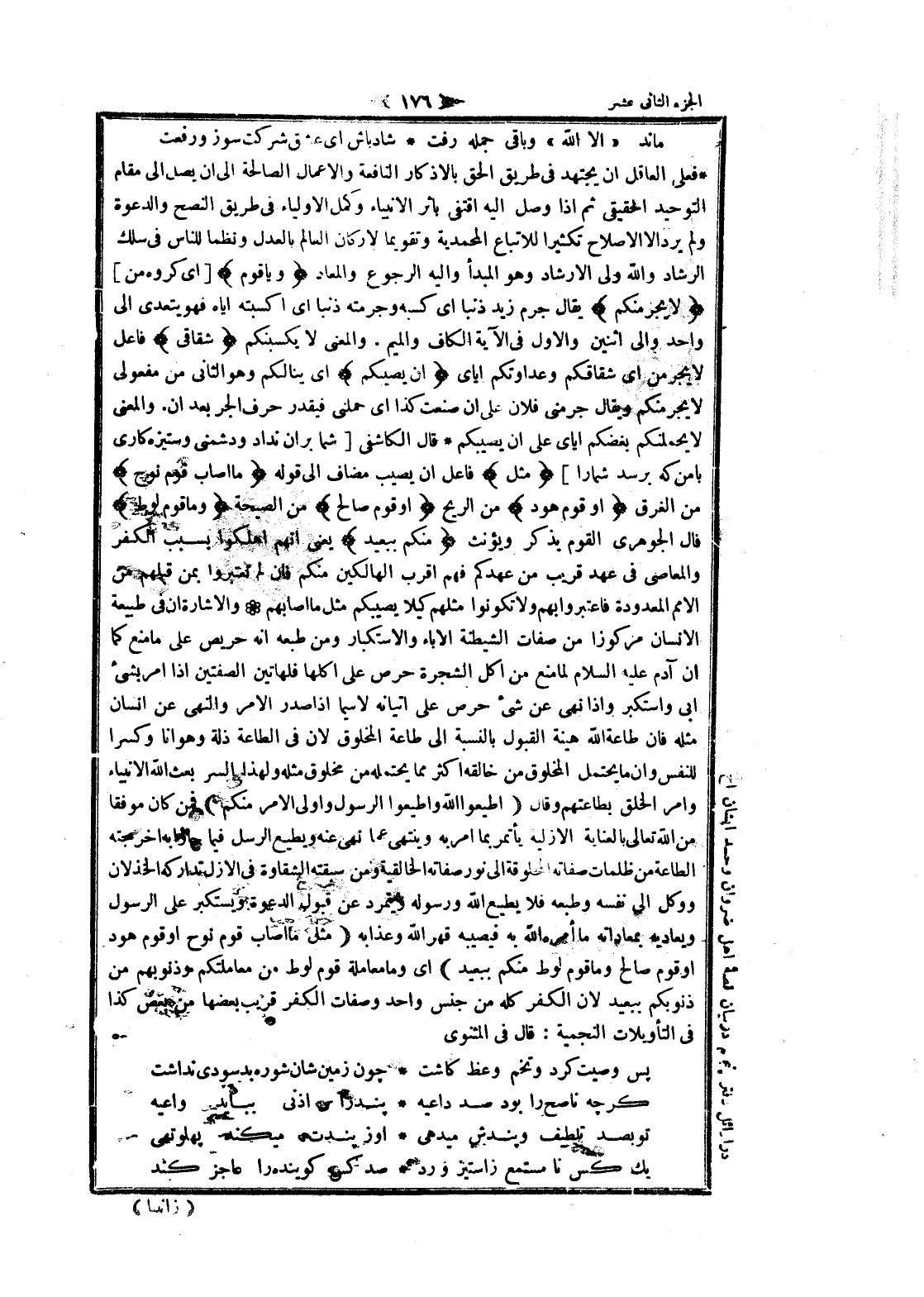 فعلى العاقل ان يجتهد فى طريق الحق بالاذكار النافعة والأعمال الصالحة الى ان يصل الى مقام التوحيد الحقيقي ثم إذا وصل اليه اقتفى بأثر الأنبياء وكمل الأولياء فى طريق النصح والدعوة ولم يرد الا الإصلاح تكثيرا للاتباع المحمدية وتقويما لاركان العالم بالعدل ونظما للناس فى سلك الرشاد والله ولى الإرشاد وهو المبدأ واليه الرجوع والمعاد وَيا قَوْمِ [اى كروه من] لا يَجْرِمَنَّكُمْ يقال جرم زيد ذنبا اى كسبه وجرمته ذنبا اى اكسبته إياه فهو يتعدى الى واحد والى اثنين والاول فى الآية الكاف والميم. والمعنى لا يكسبنكم شِقاقِي فاعل لا يجر من اى شقاقكم وعداوتكم إياي أَنْ يُصِيبَكُمْ اى ينالكم وهو الثاني من مفعولى لا يجر منكم ويقال جرمنى فلان على ان صنعت كذا اى حملنى فيقدر حرف الجر بعد ان. والمعنى لا يحملنكم بغضكم إياي على ان يصيبكم قال الكاشفى [شما بر ان نداد ودشمنى وستيزه كارى با من كه برسد شما را] مِثْلُ فاعل ان يصيب مضاف الى قوله ما أَصابَ قَوْمَ نُوحٍ من الغرق أَوْ قَوْمَ هُودٍ من الريح أَوْ قَوْمَ صالِحٍ من الصيحة وَما قَوْمُ لُوطٍ قال الجوهري القوم يذكر ويؤنث مِنْكُمْ بِبَعِيدٍ يعنى انهم اهلكوا بسبب الكفر والمعاصي فى عهد قريب من عهدكم فهم اقرب الهالكين منكم فان لم تعتبروا بمن قبلهم من الأمم المعدودة فاعتبروا بهم ولا تكونوا مثلهم كيلا يصيبكم مثل ما أصابهم والاشارة ان فى طبيعة الإنسان مركوزا من صفات الشيطنة الإباء والاستكبار ومن طبعه انه حريص على ما منع كما ان آدم عليه السلام لما منع من أكل الشجرة حرص على أكلها فلهاتين الصفتين إذا امر بشئ ابى واستكبر وإذا نهى عن شىء حرص على إتيانه لا سيما إذا صدر الأمر والنهى عن انسان مثله فان طاعة الله هينة القبول بالنسبة الى طاعة المخلوق لان فى الطاعة ذلة وهوانا وكسرا للنفس وان ما يحتمل المخلوق من خالقه اكثر مما يحتمله من مخلوق مثله ولهذا السر بعث الله الأنبياء وامر الخلق بطاعتهم وقال أَطِيعُوا اللَّهَ وَأَطِيعُوا الرَّسُولَ وَأُولِي الْأَمْرِ مِنْكُمْ فمن كان موفقا من الله تعالى بالعناية الازلية يأتمر بما امر به وينتهى عما نهى عنه ويطيع الرسل فيما جاؤا به أخرجته الطاعة من ظلمات صفاته المخلوقة الى نور صفاته الخالقية ومن سبقته الشقاوة فى الأزل تداركه الخذلان ووكل الى نفسه وطبعه فلا يطيع الله ورسوله ويتمرد عن قبول الدعوة ويستكبر على الرسول ويعاديه بمعاداته ما أمره الله به فيصيبه قهر الله وعذابه مِثْلُ ما أَصابَ قَوْمَ نُوحٍ أَوْ قَوْمَ هُودٍ أَوْ قَوْمَ صالِحٍ وَما قَوْمُ لُوطٍ مِنْكُمْ بِبَعِيدٍ اى وما معاملة قوم لوط من معاملتكم وذنوبهم من ذنوبكم ببعيد لان الكفر كله من جنس واحد وصفات الكفر قريب بعضها من بعض كذا فى التأويلات النجمية: قال فى المثنوى