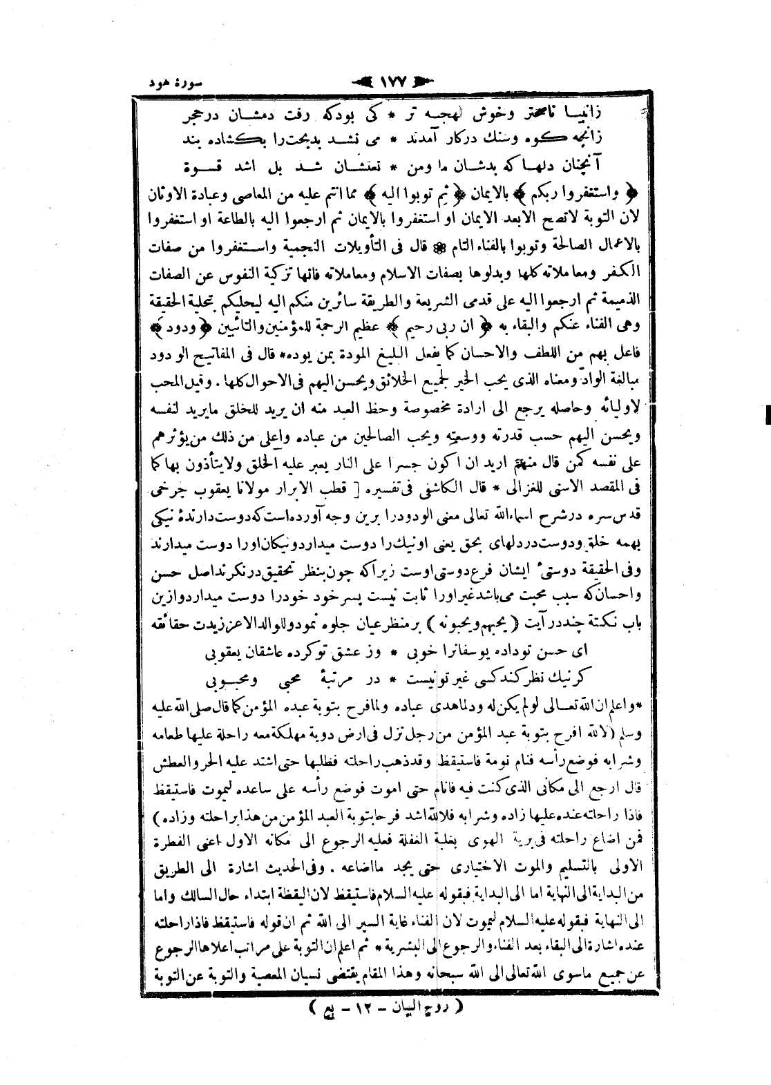 واعلم ان الله تعالى لو لم يكن له ود لما هدى عباده ولما فرح بتوبة عبده المؤمن كما قال صلى الله عليه وسلم (لا لله افرح بتوبة عبد المؤمن من رجل نزل فى ارض دوية مهلكة معه راحلة عليها طعامه وشرا به فوضع رأسه فنام نومة فاستيقظ وقد ذهب راحلته فطلبها حتى اشتد عليه الحر والعطش قال ارجع الى مكانى الذي كنت فيه فانام حتى أموت فوضع رأسه على ساعده ليموت فاستيقظ فاذا راحلته عنده عليها زاده وشرابه فلا لله أشد فرحابتوبة العبد المؤمن من هذا براحلته وزاده) فمن أضاع راحلته فى برية الهوى بغلبة الغفلة فعليه الرجوع الى مكانه الاول اعنى الفطرة الاولى بالتسليم والموت الاختياري حتى يجد ما إضاعة. وفى الحديث اشارة الى الطريق من البداية الى النهاية اما الى البداية فبقوله عليه السلام فاستيقظ لان اليقظة ابتداء حال السالك واما الى النهاية فبقوله عليه السلام ليموت لان الفناء غاية السير الى الله ثم ان قوله فاستيقظ فاذا راحلته عنده اشارة الى البقاء بعد الفناء والرجوع الى البشرية ثم اعلم ان التوبة على مراتب أعلاها الرجوع عن جميع ما سوى الله تعالى الى الله سبحانه وهذا المقام يقتضى نسيان المعصية والتوبة عن التوبة