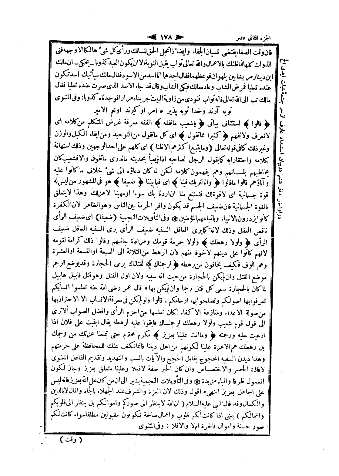 فان وقت الصفاء يقتضى نسيان الجفاء وايضا إذا تجلى الحق للسالك ورأى كل شىء هالكا الا وجهه فنى الذوات كلها فما ظنك بالأعمال والله تعالى تواب يقبل التوبة الا ان يكون العبد كذوبا- يحكى- ان مالك ابن دينار مر بشابين يلهوان فوعظهما فقال أحدهما انا اسد من الأسود فقال مالك سيأتيك اسد تكون عنده ثعلبا فمرض الشاب وعاده مالك فبكى الشاب وقال قد جاء الأسد الذي صرت عنده ثعلبا فقال مالك تب الى الله تعالى فانه تواب فنودى من زاوية البيت جربناه مرارا فوجدناه كذوبا: وفى المثنوى