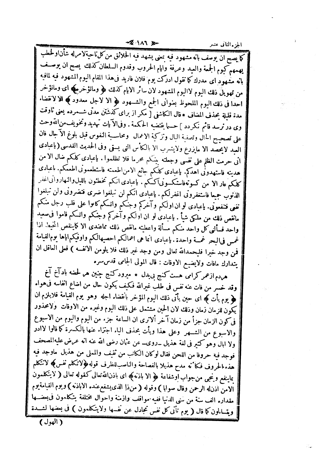 كما يصح ان يوصف بانه مشهود فيه بمعنى يشهد فيه الخلائق من كل ناحية لامر له شأن او لخطب يهمهم كيوم الجمعة والعيد وعرفة وايام الحروب وقدوم السلطان كذلك يصح ان يوصف بانه مشهود اى مدرك كما تقول أدركت يوم فلان فاريد فى هذا المقام اليوم المشهود فيه لما فيه من تهويل ذلك اليوم لا اليوم المشهود لان سائر الأيام كذلك وَما نُؤَخِّرُهُ اى وما نؤخر أحدا فى ذلك اليوم الملحوظ بعنوانى الجمع والشهود إِلَّا لِأَجَلٍ مَعْدُودٍ الا لانقضاء مدة قليلة بحذف المضاف قال الكاشفى [مگر از براى گذشتن مدتى شمرده يعنى تا وقت وى در نرسد قائم نگردد] حسما يقتضيه الحكمة. وفى الآيات تهديد وتخويف من الله وحث على تصحيح الحال وتصفية البال وتزكية الأعمال ومحاسبة النفوس قبل بلوغ الآجال فان العبد لا يحصد الا ما يزرع ولا يشرب الا بالكأس التي يسقى وفى الحديث القدسي (يا عبادى انى حرمت الظلم على نفسى وجعلته بينكم محرما فلا تظلموا. يا عبادى كلكم ضال الا من هديته فاستهدونى أهدكم. يا عبادى كلكم جائع الا من أطعمته فاستطعمونى أطعمكم. يا عبادى كلكم عار الا من كسوته فاستكسونى اكسكم. يا عبادى انكم تخطئون بالليل والنهار وانى اغفر الذنوب جميعا فاستغفرونى اغفر لكم. يا عبادى انكم لن تبلغوا ضرى فتضرونى ولن تبلغوا نفعى فتنفعونى. يا عبادى لو ان او لكم وآخركم وجنكم وانسكم كانوا على قلب رجل منكم ما نقص ذلك من ملكى شيأ. يا عبادى لو ان أولكم وآخركم وجنكم وانسكم قاموا فى صعيد واحد فسألنى كل واحد منكم مسألة وأعطيته ما نقص ذلك مما عندى الا كما ينقص المخيط إذا غمس فى البحر غمسة واحدة. يا عبادى انما هى أعمالكم أحصيها لكم واو فيكم إياها يوم القيامة فمن وجد خيرا فليحمد الله تعالى ومن وجد غير ذلك فلا يلومن إلا نفسه) فعلى العاقل ان يتدارك ما فات ولا يضيع الأوقات: قال المولى الجامى قدس سره