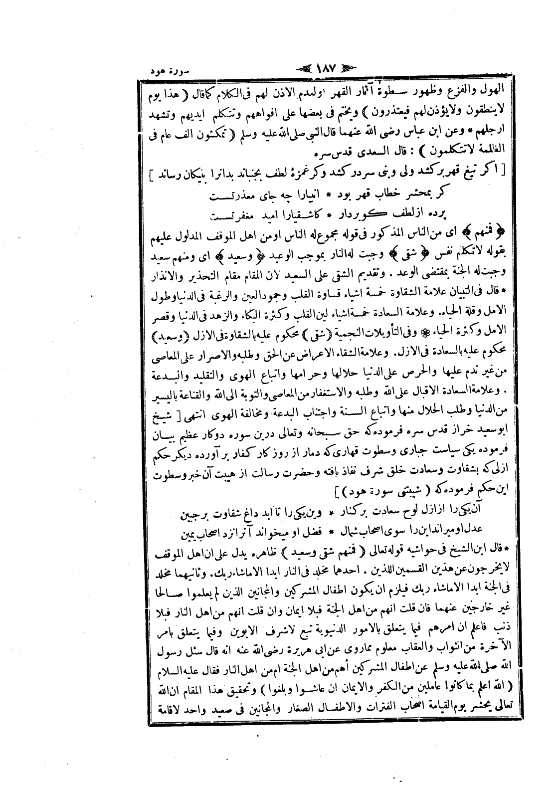 قال ابن الشيخ فى حواشيه قوله تعالى فَمِنْهُمْ شَقِيٌّ وَسَعِيدٌ ظاهره يدل على ان اهل الموقف لا يخرجون عن هذين القسمين اللذين. أحدهما مخلد فى النار ابدا الا ما شاء ربك. وثانيهما مخلد فى الجنة ابدا الا ما شاء ربك فيلزم ان يكون أطفال المشركين والمجانين الذين لم يعلموا صالحا غير خارجين عنهما فان قلت انهم من اهل الجنة فبلا ايمان وان قلت انهم من اهل النار فبلا ذنب فاعلم ان أمرهم فيما يتعلق بالأمور الدنيوية تبع لا شرف الأبوين وفيما يتعلق بامر الآخرة من الثواب والعقاب معلوم مما روى عن ابى هريرة رضى الله عنه انه قال سئل رسول الله صلى الله عليه وسلم عن أطفال المشركين أهم من اهل الجنة أم من اهل النار فقال عليه السلام (الله اعلم بما كانوا عاملين من الكفر والايمان ان عاشوا وبلغوا) وتحقيق هذا المقام ان الله تعالى يحشر يوم القيامة اصحاب الفترات والأطفال الصغار والمجانين فى صعيد واحد لا قامة