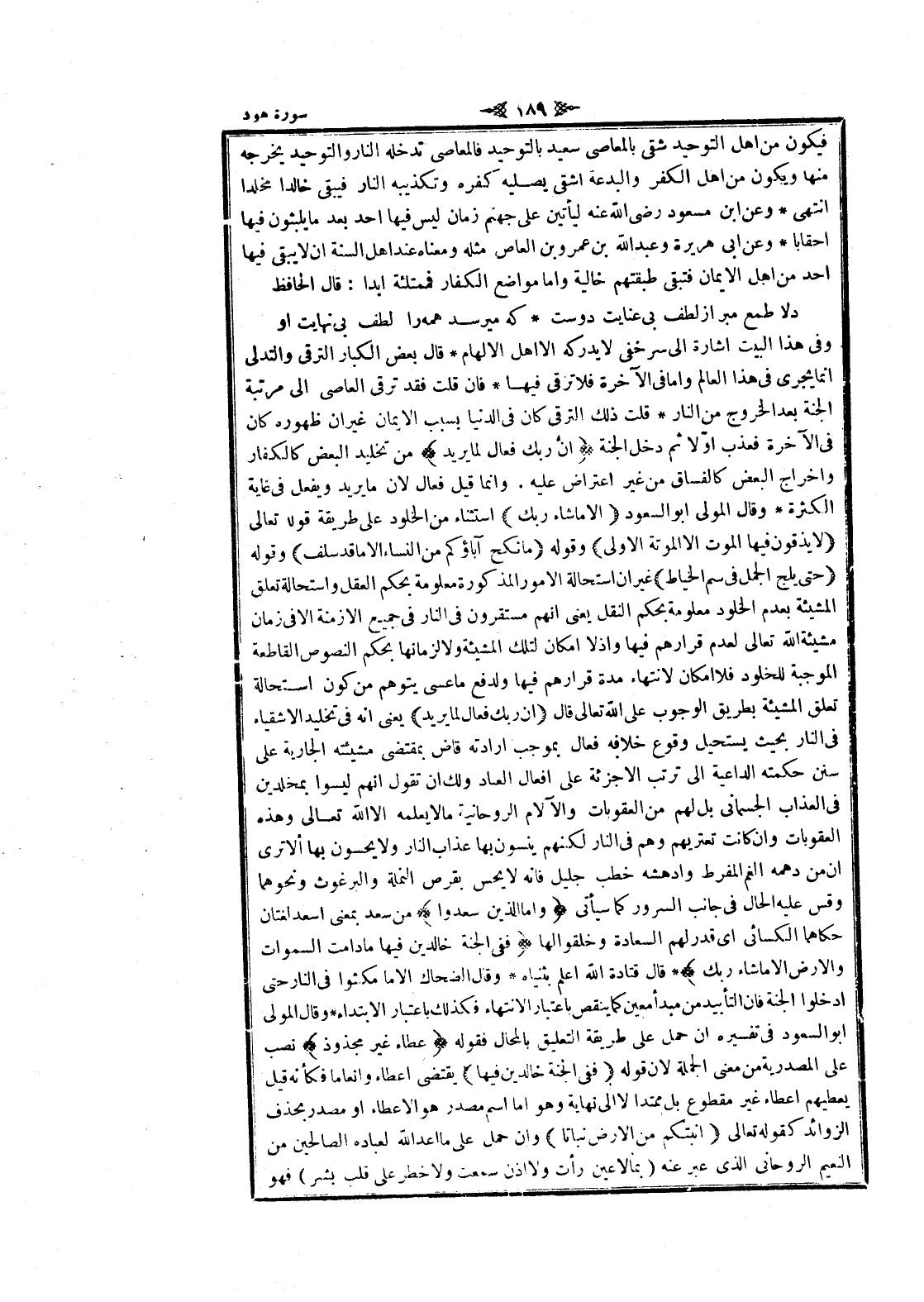 وفى هذا البيت اشارة الى سر خفى لا يدركه الا اهل الإلهام قال بعض الكبار الترقي والتدلي انما يجرى فى هذا العالم واما فى الآخرة فلا ترقى فيها فان قلت فقد ترقى العاصي الى مرتبة الجنة بعد الخروج من النار قلت ذلك الترقي كان فى الدنيا بسبب الايمان غير ان ظهوره كان فى الآخرة فعذب اوّلا ثم دخل الجنة إِنَّ رَبَّكَ فَعَّالٌ لِما يُرِيدُ من تخليد البعض كالكفار وإخراج البعض كالفساق من غير اعتراض عليه. وانما قيل فعال لان ما يريد ويفعل فى غاية الكثرة وقال المولى ابو السعود إِلَّا ما شاءَ رَبُّكَ استثناء من الخلود على طريقة قوله تعالى لا يَذُوقُونَ فِيهَا الْمَوْتَ إِلَّا الْمَوْتَةَ الْأُولى وقوله ما نَكَحَ آباؤُكُمْ مِنَ النِّساءِ إِلَّا ما قَدْ سَلَفَ وقوله حَتَّى يَلِجَ الْجَمَلُ فِي سَمِّ الْخِياطِ غير ان استحالة الأمور المذكورة معلومة بحكم العقل واستحالة تعلق المشيئة بعدم الخلود معلومة بحكم النقل يعنى انهم مستقرون فى النار فى جميع الازمنة الا فى زمان مشيئة الله تعالى لعدم قرارهم فيها وإذ لا إمكان لتلك المشيئة ولا لزمانها بحكم النصوص القاطعة الموجبة للخلود فلا إمكان لانتهاء مدة قرارهم فيها ولدفع ما عسى يتوهم من كون استحالة تعلق المشيئة بطريق الوجوب على الله تعالى قال إِنَّ رَبَّكَ فَعَّالٌ لِما يُرِيدُ يعنى انه فى تخليد الأشقياء فى النار بحيث يستحيل وقوع خلافه فعال بموجب إرادته قاض بمقتضى مشيئته الجارية على سنن حكمته الداعية الى ترتب الاجزئة على افعال العباد ولك ان تقول انهم ليسوا بمخلدين فى العذاب الجسماني بل لهم من العقوبات والآلام الروحانية ما لا يعلمه الا الله تعالى وهذه العقوبات وان كانت تعتريهم وهم فى النار لكنهم ينسون بها عذاب النار ولا يحسون بها ألا ترى ان من دهمه الغم المفرط وأدهشه خطب جليل فانه لا يحس بقرص النملة والبرغوث ونحوهما وقس عليه الحال فى جانب السرور كما سيأتى وَأَمَّا الَّذِينَ سُعِدُوا من سعد بمعنى اسعد لغتان حكاهما الكسائي اى قدر لهم السعادة وخلقوا لها فَفِي الْجَنَّةِ خالِدِينَ فِيها ما دامَتِ السَّماواتُ وَالْأَرْضُ إِلَّا ما شاءَ رَبُّكَ قال قتادة الله اعلم بثنياه وقال الضحاك الا ما مكثوا فى النار حتى ادخلوا الجنة فان التأبيد من مبدأ معين كما ينقص باعتبار الانتهاء فكذلك باعتبار الابتداء وقال المولى ابو السعود فى تفسيره ان حمل على طريقة التعليق بالمحال فقوله عَطاءً غَيْرَ مَجْذُوذٍ نصب على المصدرية من معنى الجملة لان قوله فَفِي الْجَنَّةِ خالِدِينَ فِيها يقتضى إعطاء وانعاما فكأنه قيل يعطيهم إعطاء غير مقطوع بل ممتدا لا الى نهاية وهو اما اسم مصدر هو الإعطاء او مصدر بحذف الزوائد كقوله تعالى أَنْبَتَكُمْ مِنَ الْأَرْضِ نَباتاً وان حمل على ما أعد الله لعباده الصالحين من النعيم الروحاني الذي عبر عنه (بما لا عين رأت ولا اذن سمعت ولا خطر على قلب بشر) فهو