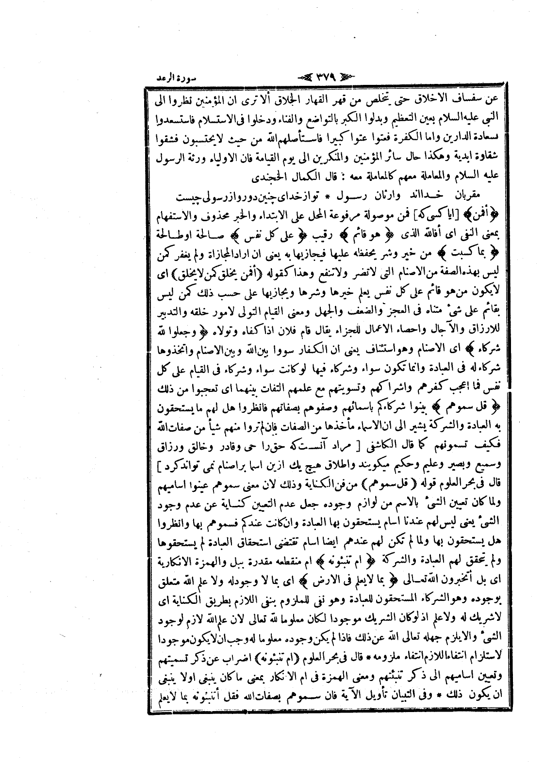 من خير وشر يحفظه عليها فيجازيها به يعنى ان أراد المجازاة ولم يغفر كمن ليس بهذه الصفة من الأصنام التي لا تضر ولا تنفع وهذا كقوله أَفَمَنْ يَخْلُقُ كَمَنْ لا يَخْلُقُ اى لا يكون من هو قائم على كل نفس يعلم خيرها وشرها ويجازيها على حسب ذلك كمن ليس بقائم على شىء متناه فى العجز والضعف والجهل ومعنى القيام التولي لامور خلقه والتدبير للارزاق والآجال وإحصاء الأعمال للجزاء يقال قام فلان إذا كفاه وتولاه وَجَعَلُوا لِلَّهِ شُرَكاءَ اى الأصنام وهو استئناف يعنى ان الكفار سووا بين الله وبين الأصنام واتخذوها شركاء له فى العبادة وانما تكون سواء وشركاء فيها لو كانت سواء وشركاء فى القيام على كل نفس فما اعجب كفرهم واشراكهم وتسويتهم مع علمهم التفات بينهما اى تعجبوا من ذلك قُلْ سَمُّوهُمْ بينوا شركاءكم بأسمائهم وصفوهم بصفاتهم فانظروا هل لهم ما يستحقون به العبادة والشركة يشير الى ان الأسماء مأخذها من الصفات فان لم تروا منهم شيأ من صفات الله فكيف تسمونهم كما قال الكاشفى [مراد آنست كه حق را حى وقادر وخالق ورزاق وسميع وبصير وعليم وحكيم ميگويند واطلاق هيچ يك ازين اسما بر أصنام نمى تواند كرد] قال فى بحر العلوم قوله قُلْ سَمُّوهُمْ من فن الكناية وذلك لان معنى سموهم عينوا أساميهم ولما كان تعيين الشيء بالاسم من لوازم وجوده جعل عدم التعيين كناية عن عدم وجود الشيء يعنى ليس لهم عندنا اسام يستحقون بها العبادة وان كانت عندكم فسموهم بها وانظروا هل يستحقون بها ولما لم تكن لهم عندهم ايضا اسام تقتضى استحقاق العبادة لم يستحقوها ولم يتحقق لهم العبادة والشركة أَمْ تُنَبِّئُونَهُ أم منقطعة مقدرة ببل والهمزة الانكارية اى بل أتخبرون الله تعالى بِما لا يَعْلَمُ فِي الْأَرْضِ اى بما لا وجود له ولا علم الله متعلق بوجوده وهو الشركاء المستحقون للعبادة وهو نفى للملزوم بنفي اللازم بطريق الكناية اى لا شريك له ولا علم إذ لو كان الشريك موجودا لكان معلوما لله تعالى لان علم الله لازم لوجود الشيء والا يلزم جهله تعالى الله عن ذلك فاذا لم يكن وجوده معلوما له وجب ان لا يكون موجودا لاستلزام انتفاء اللازم انتفاء ملزومه قال فى بحر العلوم أَمْ تُنَبِّئُونَهُ إضراب عن ذكر تسميتهم وتعيين أساميهم الى ذكر تنبئتهم ومعنى الهمزة فى أم الإنكار بمعنى ما كان ينبغى او لا ينبغى ان يكون ذلك وفى التبيان تأويل الآية فان سموهم بصفات الله فقل أتنبئونه بما لا يعلم